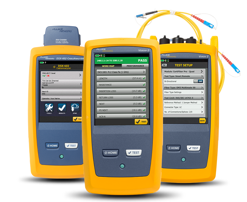 Le DSX intègre le système modulaire de certification de câblage Versiv™ de Fluke Networks, qui permet de réduire les coûts d’installation et de maintenance de câblage jusqu’à 65 %. Les pierres angulaires du système Versiv sont d’une part l’interface graphique intuitive Taptive™, pour une utilisation facile et sans erreur, et d’autre part le système de gestion ProjX™, qui garantissent que tous les tests sont effectués efficacement et correctement. Le système Versiv a récemment été mis à niveau avec un réflectomètre optique temporel (OTDR) à dynamique élevée, et une caméra d’inspection de fibres MPO.