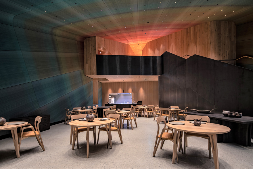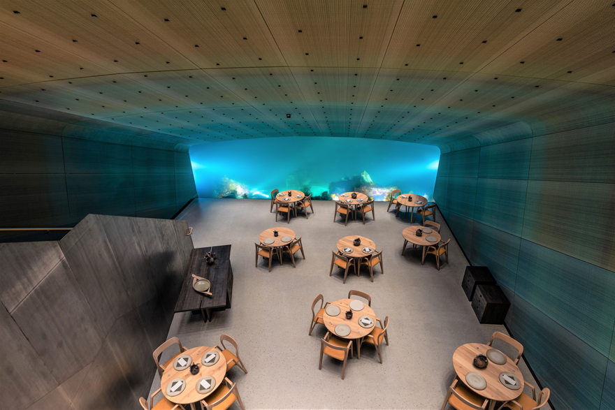 Le voyage du visiteur s’articule sur trois niveaux, un peu comme une plongée, mais sans combinaisons ni bouteilles. Depuis l’entrée, on accède à la zone du vestiaire puis, en descendant d’un niveau, au Champagne bar, qui marque la transition de la côte à l’océan. Ce passage physique est aussi souligné par une étroite fenêtre en acrylique qui coupe verticalement les niveaux du restaurant. Du bar, le client a vue sur les fonds marins, vers le bas, où se trouve le restaurant. Là, deux longues tables à manger et d’autres, plus petites, sont installées face à la grande fenêtre panoramique…