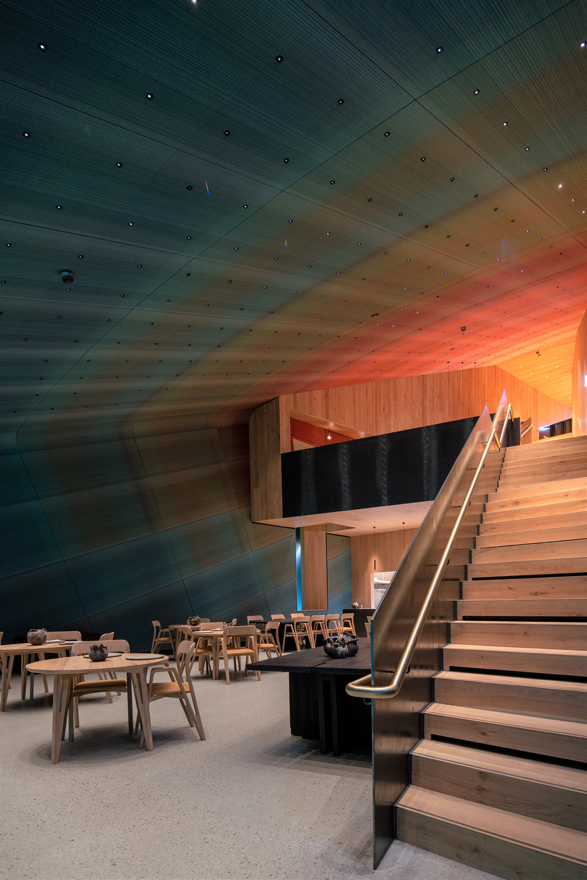 La palette des coloris adoptée au restaurant suit la logique des différents espaces de la construction : alors que le bar à champagne se décline dans les couleurs tendres de la région de la côte qui rappellent les sédiments de roche, coquillages et sable, la salle à manger est plongée dans les tons plus foncés de bleu et de vert, inspirés des fonds marins, des algues et de la mer agitée. La couleur chaude du bois de chêne utilisé pour l’intérieur du restaurant tranche avec le gris de la coque en béton, en créant une atmosphère intime.