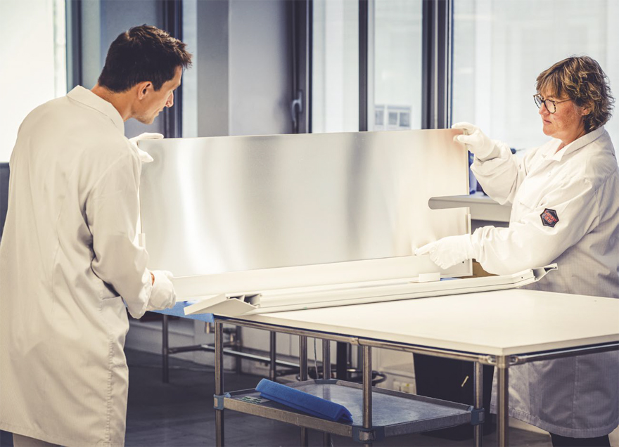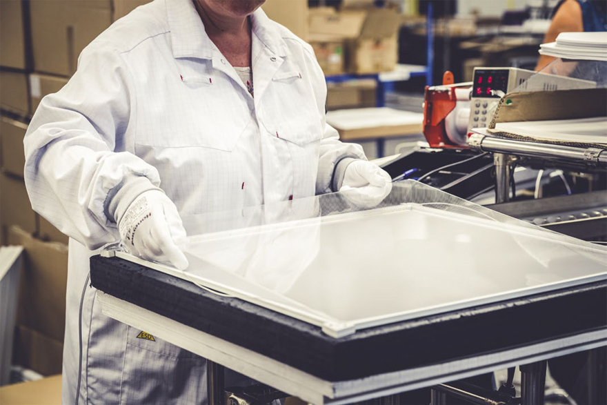 L’assemblage du luminaire Albedo exige un très haut niveau de technicité. Destiné à l’éclairage des cabinets dentaires, il est constitué de plus de 60 composants, notamment des films optiques, qui doivent être appliqués les uns contre les autres. 100 % des composants de structure sont produits localement, par trois fournisseurs installés à moins de 100 km du site.