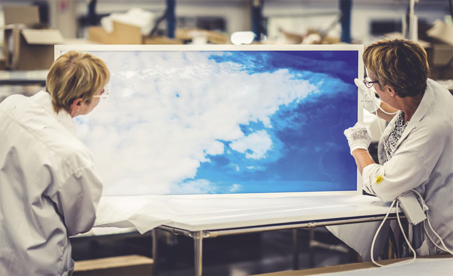 Depuis 10 ans, chaque luminaire est réalisé sur mesure, avec une impression spécifique. Selon les besoins, l’impression est effectuée soit directement sur le polycarbonate, soit sur un film appliqué sur le luminaire. Le premier projet, finalisé en 2013, visait à recréer un ciel dans un hôpital pour « enfants de la Lune », avec 21 luminaires placés côte à côte. Chaque luminaire subit un contrôle qualité très poussé, pour détecter les éventuels défauts d’impression.