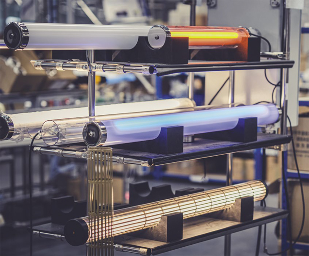 La gamme Tubular nécessite de maîtriser à la fois l’optique et la led. Cela souligne les savoir-faire multiples des ingénieurs : sur la photo ci-contre, en bas, un luminaire design, en haut, une version ambre destinée aux caves à champagne, au centre, une adaptation pour la signalisation dans le transport ferroviaire. Cette gamme couvre un large champ d’applications, de la décoration à l’immersion complète.