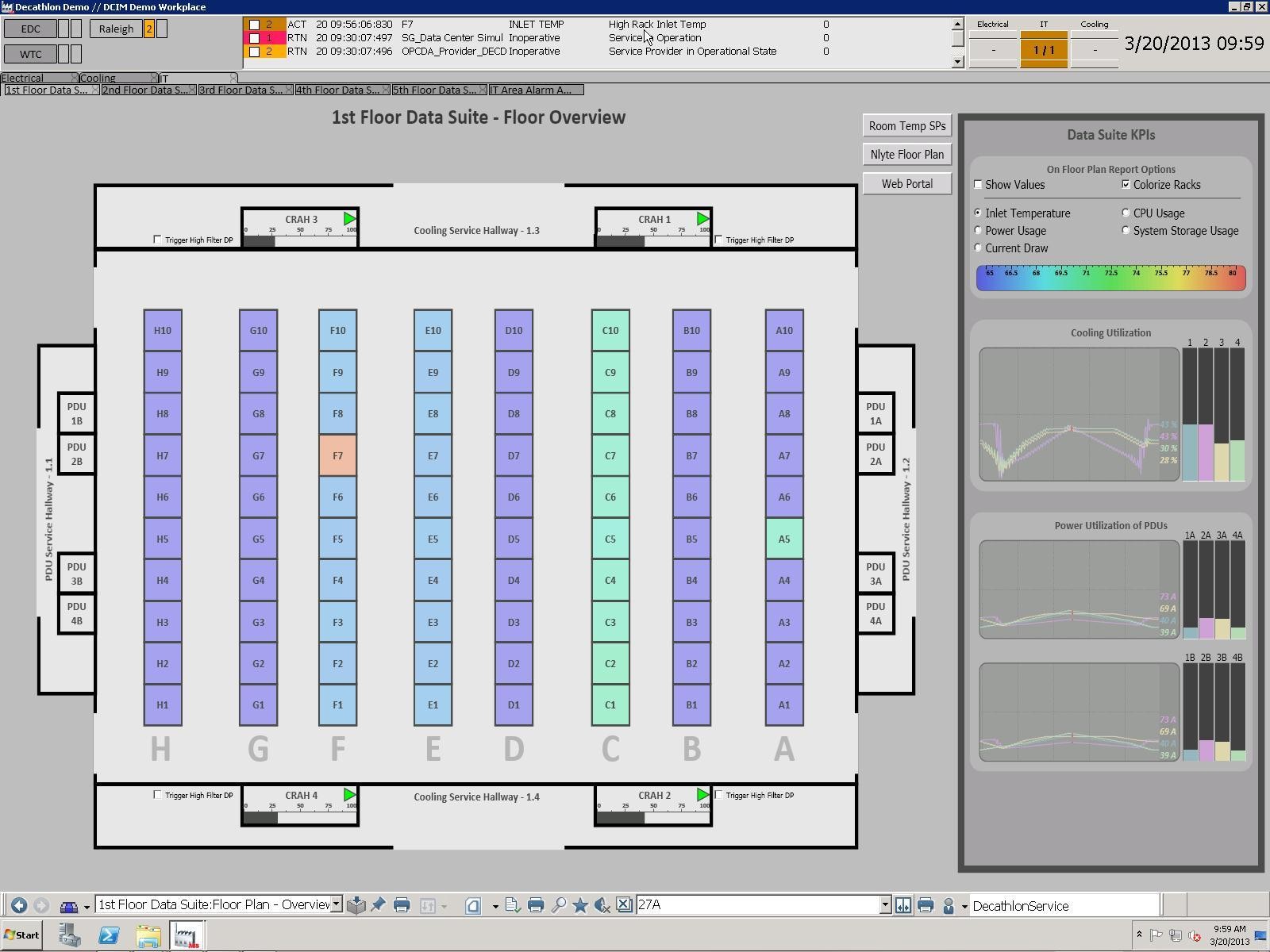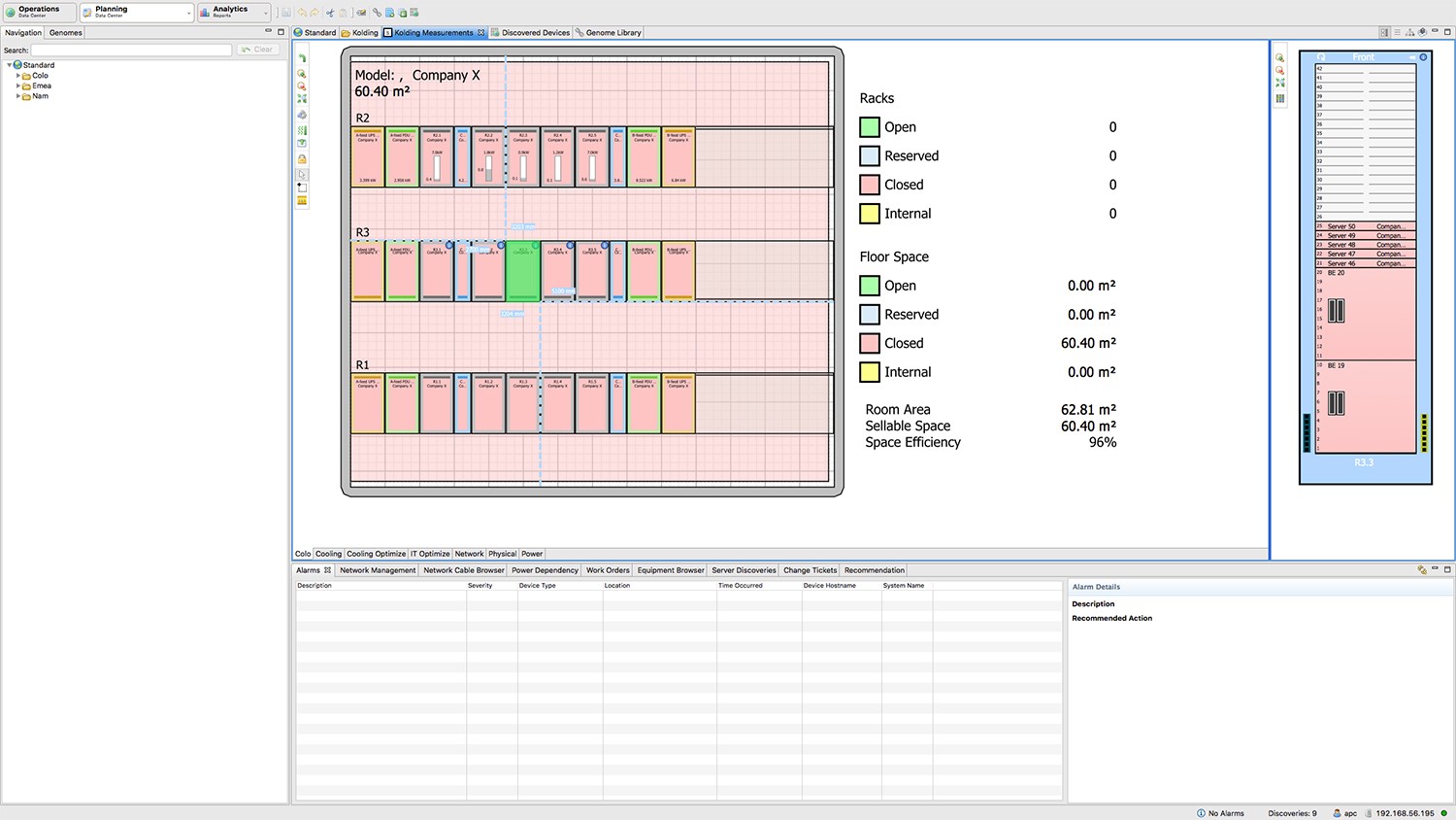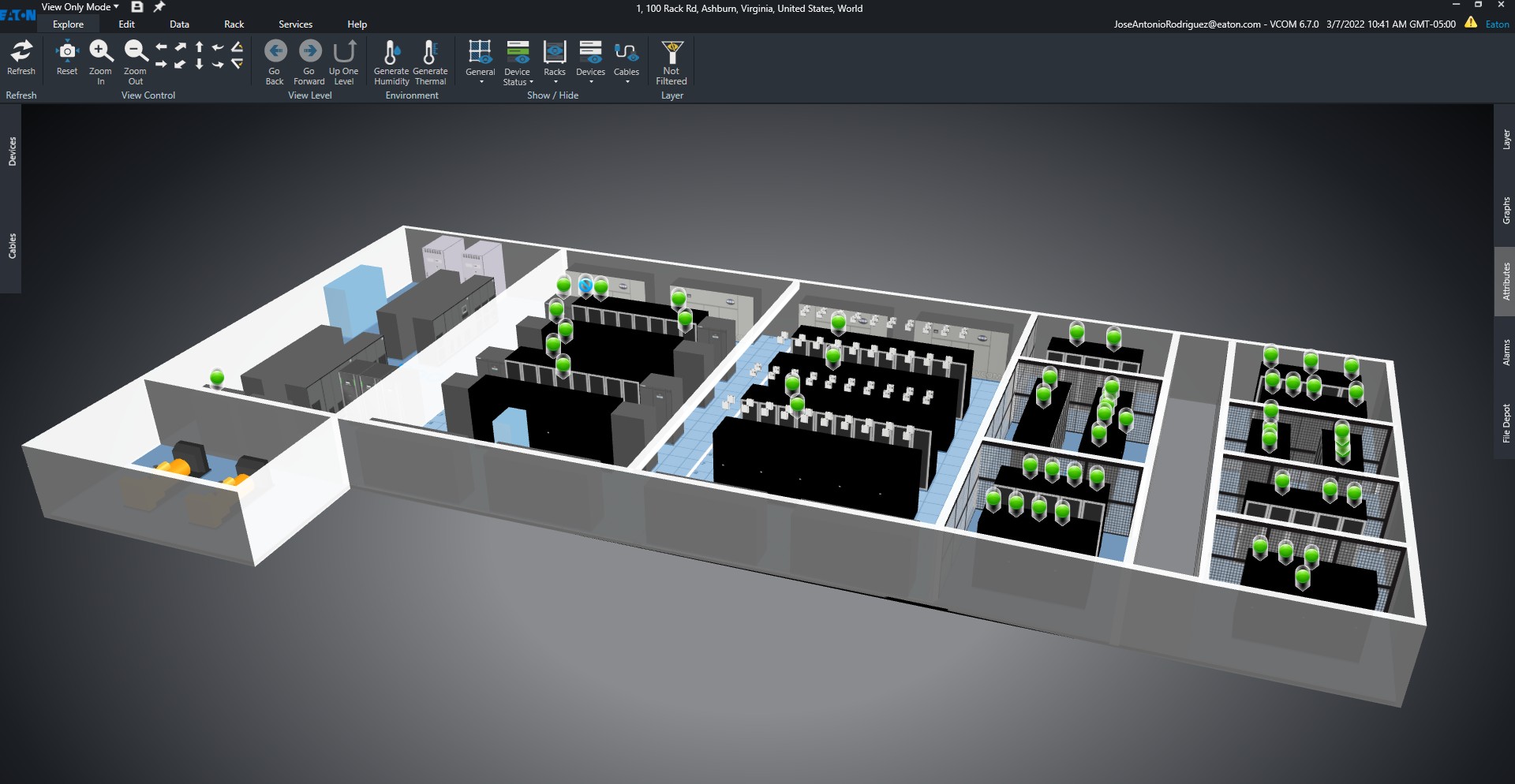 • visualiser des rendus 3D à tous les niveaux du datacenter et de l’entreprise (alimentation, espace, environnement, réseau informatique, virtualisation) et identifier les problèmes pour une grande variété d’actifs informatiques, notamment les serveurs physiques, les VM hosts, les VM guests, les commutateurs, les PDU, les onduleurs et les dispositifs pour grandes installations (groupe électrogène, etc.) ;