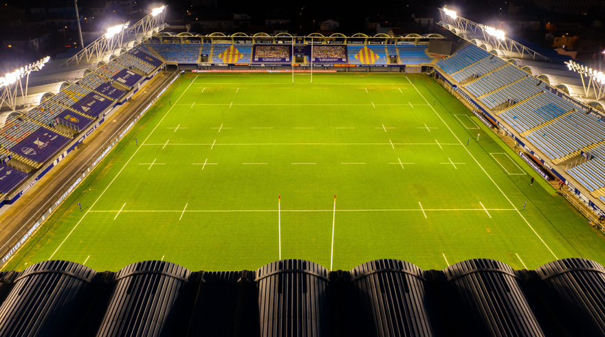 Le stade Aimé-Giral, à Perpigan, a bénéficié d’une rénovation pour répondre aux normes de la Ligue nationale de rugby (LNR). L’installation d’éclairage se compose des luminaires OMNIblast 3 et OMNIblast 2 de Comatelec Schréder. © Comatelec Schréder