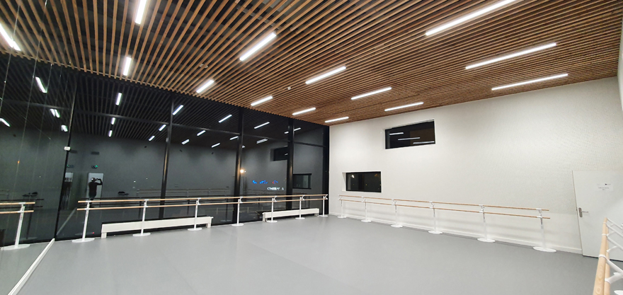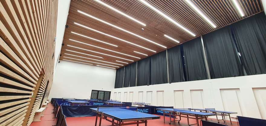 Dans les salles de tennis de table et de danse, des profils aluminium linéaires (Venice) intégrés au plafond de bois : ils procurent respectivement 782 lux moyens (pour 750 lux exigés) et 450 lux.