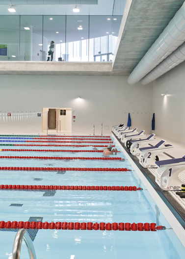 Le sous-sol accueille la zone des piscines avec un bassin olympique de 50 m et un autre de 25 m. Dans cette zone, le jour, l’éclairage est diffus, homogène, offrant une atmosphère lumineuse éclatante. Au niveau des bassins, les appliques Lander instaurent un rythme, avec des petits îlots de lumière, soulignant la grande longueur des murs.