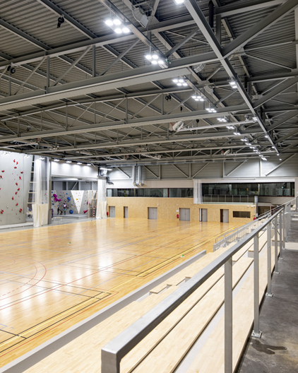 Le mur d’escalade bénéficie d’un éclairage réalisé à l’aide de projecteurs Nadir, IK 10, à micro-lentilles qui fournissent un flux unitaire de 22 200 lm, et disposés sur les poutres en face du mur.