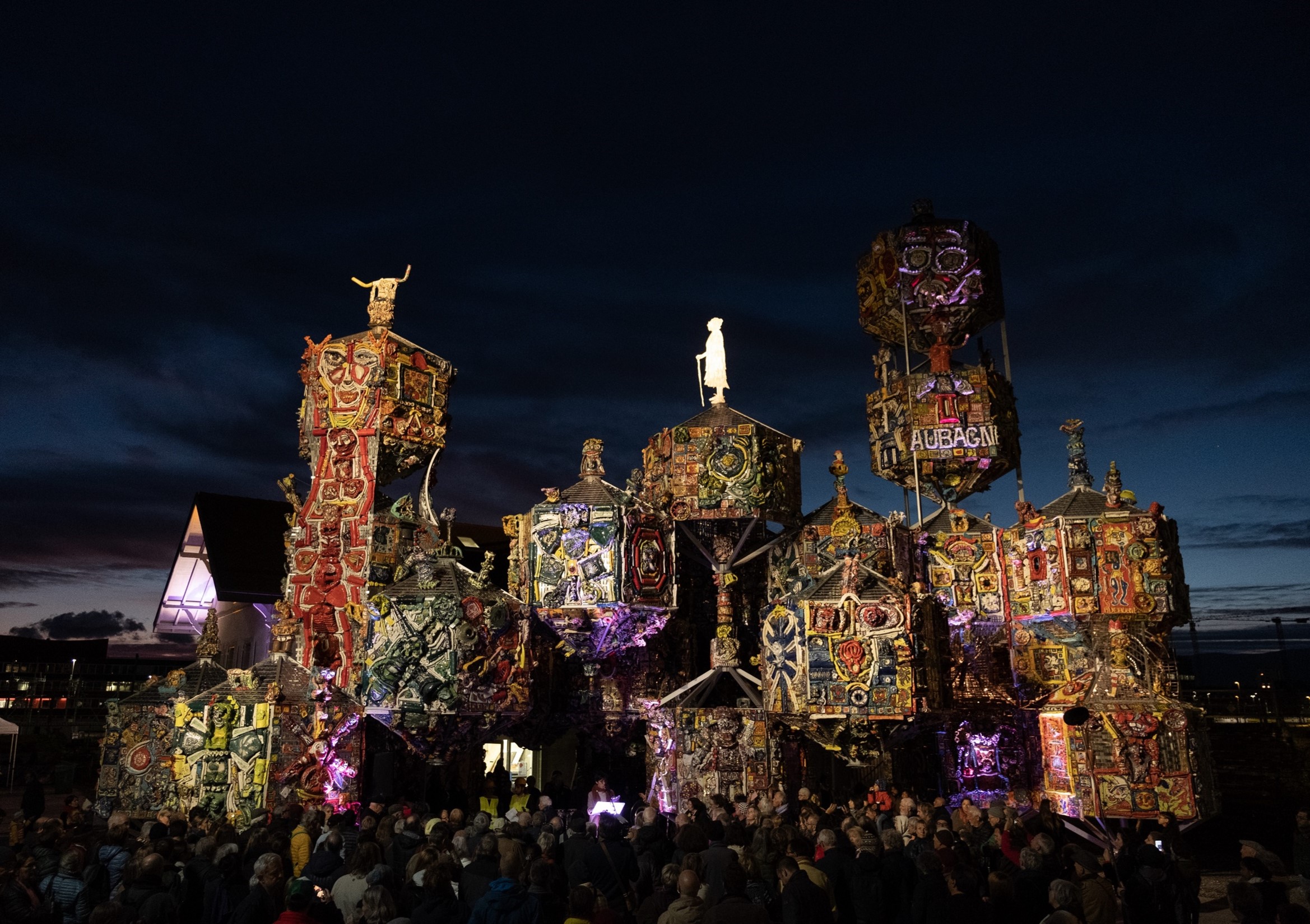 « Face à ce « colossal » d’art brut, il est proposé à la ferme des Tilleuls d’inviter les habitants de la barre de logements sociaux situés en face à interagir avec l’œuvre, et de développer même des récits, dans un cadre de production collaborative. Tout l’enjeu du projet d’éclairage de l’œuvre est donc de trouver la position la plus juste du support unique des éclairages qui permettrait de respecter, et peut-être même de transcender, à la fois sa qualité plastique et métaphorique. Éclairer au mieux, mais avec la retenue du conteur, pour ne pas surenchérir un récit déjà riche. Éclairer pourtant, avec intention, pour proposer une version nocturne vivante, voire vibrante, de l’œuvre.