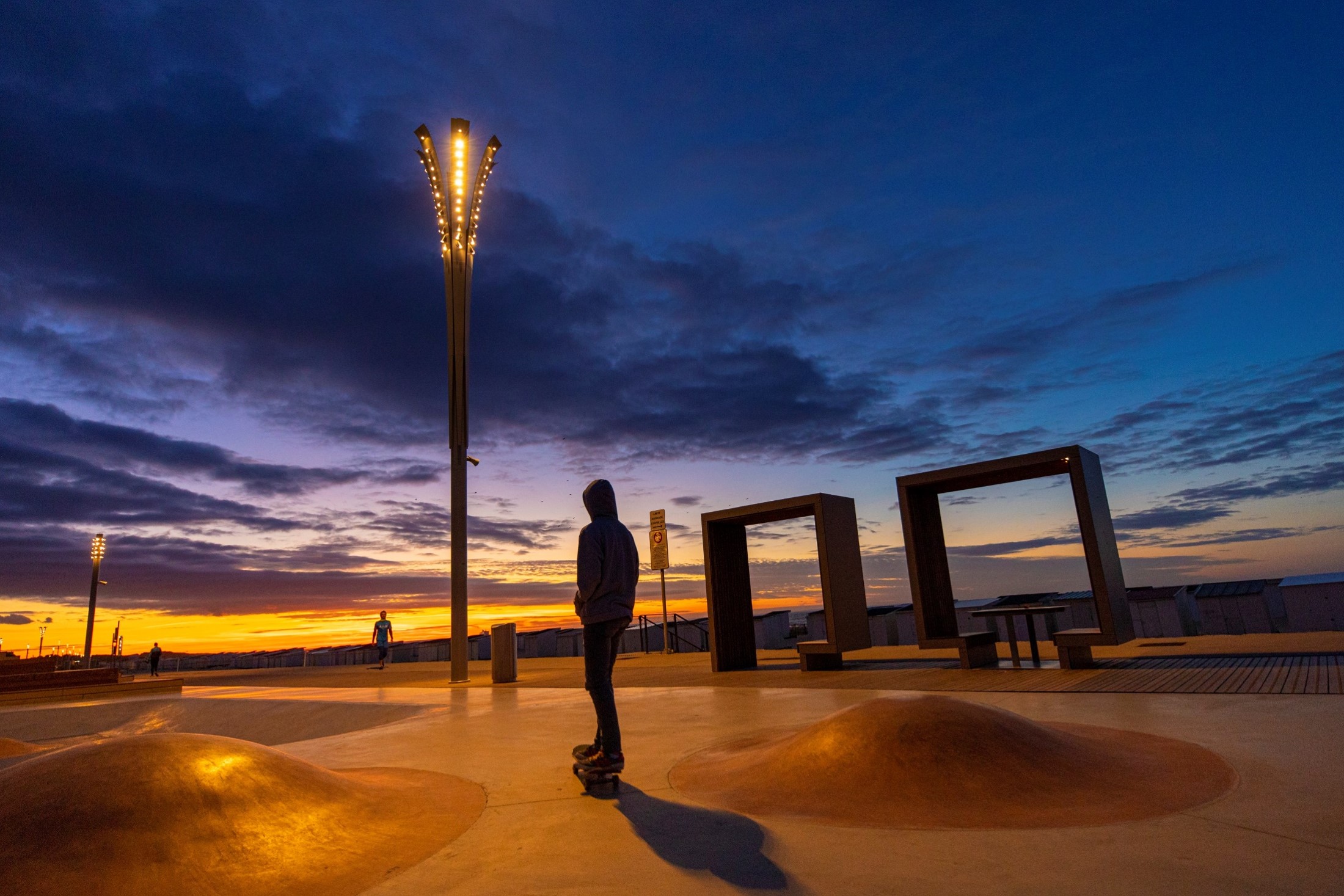 Dès lors la commune de Calais et la communauté d’agglomération du Calaisis ont décidé d’un plan d’action afin de faire du Front de Mer l’espace public majeur de Calais, véritable « référence » urbaine et culturelle, véritable destination pour les loisirs et les pratiques sportives, véritable moteur pour l’attractivité économique et touristique. Un parti pris de laisser la mer et la plage dans l’obscurité, tandis que les promenades, les aires de jeux, les espaces récréatifs sont éclairés d’une lumière chaude et enveloppe l’ensemble des usages avec quelques rehauts sur le skate-park. La gamme Flambeaux dont une version de 12,50 m de hauteur est un signal fort sur le front de mer. Pour résister aux agressions climatiques et environnementales, les matériaux utilisés devaient être robustes et pérennes, conformément au cahier des charges qui imposait des critères de conception spécifiques (pas d’entrée de sable, offrir des garanties sur la peinture, etc.). »