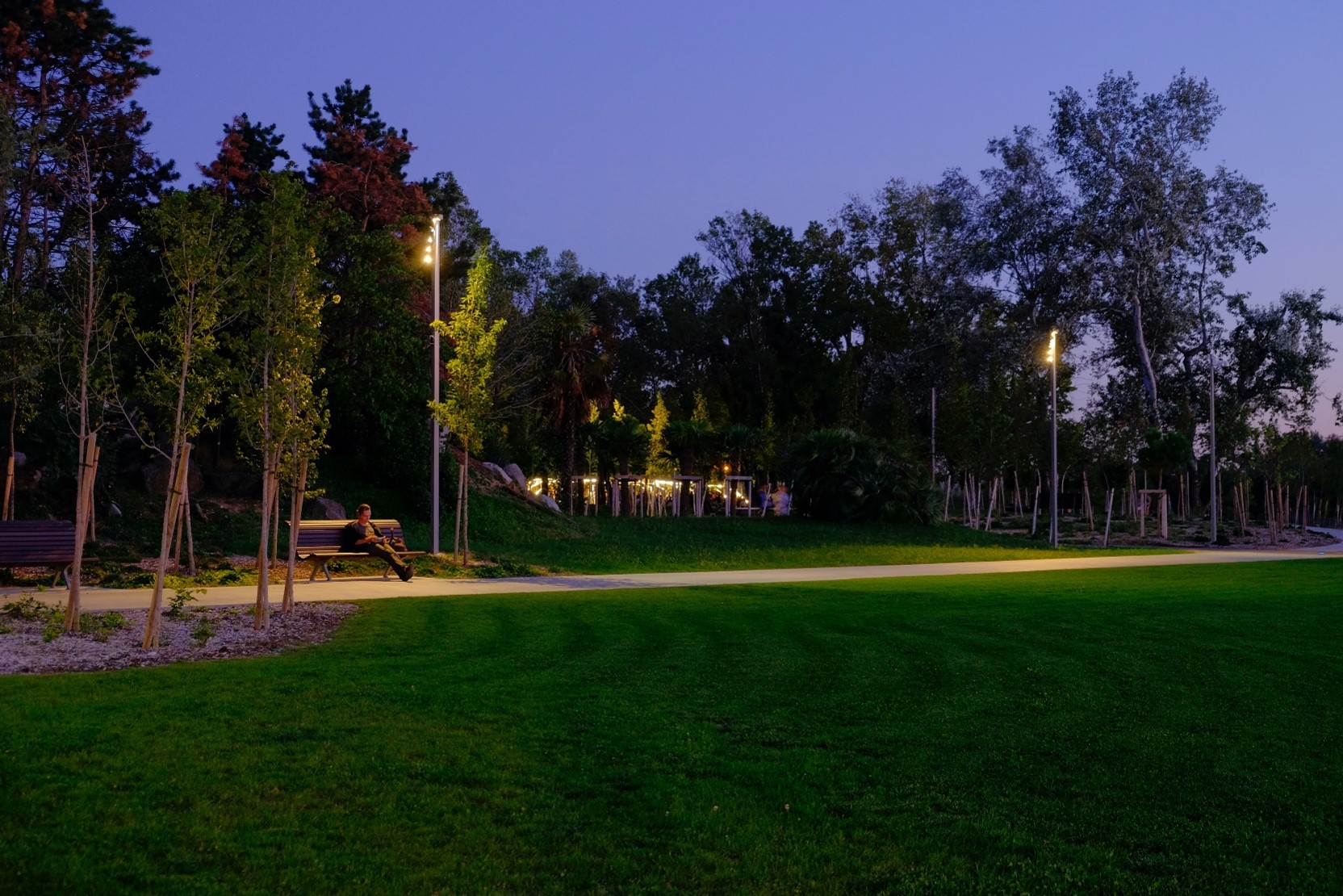 Pour créer un sentiment d’ailleurs et mettre en valeur le parc de nuit, il est bienvenu que l’éclairage rompe avec un alignement classique de mâts piétonniers à 4 m. Pour autant, sur les secteurs accessibles de nuit, les usages doivent demeurer confortables. Le cheminement entre le théâtre et le centre bourg est éclairé, et l’implantation des mâts est réglée par les plantations. Cette séquence est emblématique de l’opération, elle met en scène la présence forte du végétal planté dans le cadre de l’opération. Les mâts sont proches des arbres, et prennent les frondaisons dans les faisceaux, projetant au sol des ombres portées mouvantes. Les appareils d’éclairage sont intégrés dans des silhouettes de mobiliers de sections fines. Les points lumineux sont volontairement de petites puissances (6 W), miniatures (49 mm x 80 mm) et orientables indépendamment, les optiques et températures de couleur sont variées afin de créer des ambiances vives et animées. En complément de ces matériels, des encastrés solaires au sol assurent le balisage de la Via Rhôna, itinéraire cyclable de 815 km du Léman à la méditerranée qui traverse le parc, et la présence de la scène réalisée en béton installée sur les berges du Rhône.