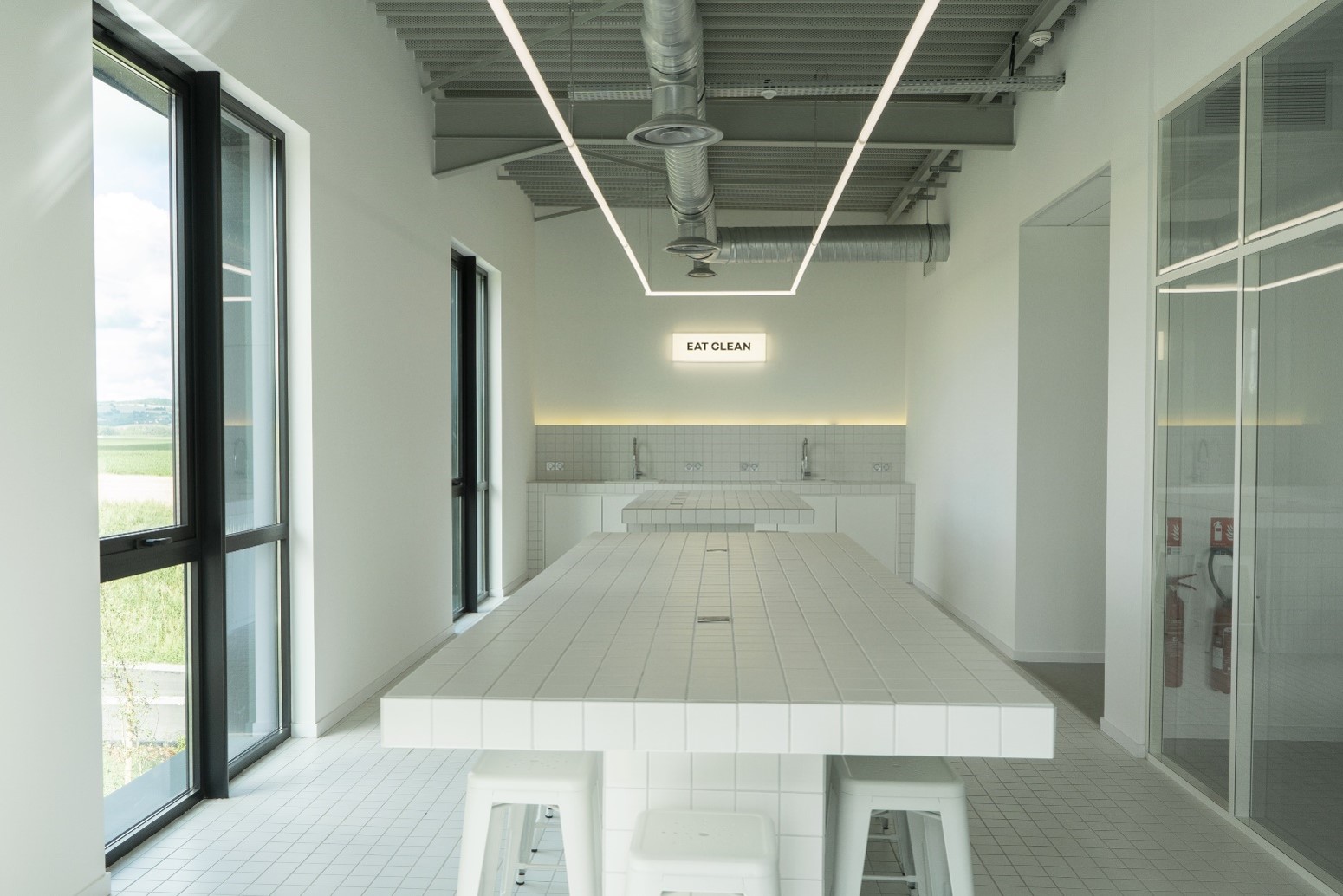 Dans les aires de stockage, le quantitatif et l’agencement des luminaires ont été optimisés pour allier niveau lumineux adéquat selon la disposition des racks et confort visuel. Dans les espaces de production, des dalles leds micropismatiques ont permis de maitriser le budget de ces zones moins occupées, tout en gardant un excellent confort visuel. Dans les circulations, un ruban led dissimulé dans une vasque diffusante offre un éclairage uniforme. Le niveau global a été réglé à 100 lux. »