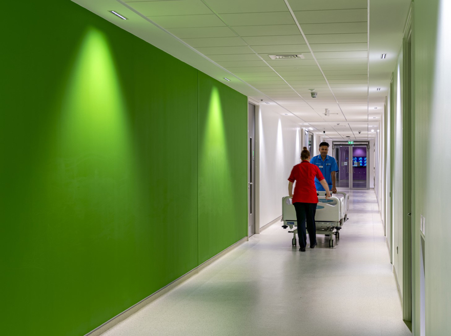 Les luminaires Slotlight Infinity RGBW (comprenant des led rouges, vertes, bleues et blanches) éclairent les zones des lits de l’USN et les zones de la baie de l’USI. En plus de fournir une lumière blanche naturelle, le luminaire offre une variété de nouvelles possibilités telles que la création de couleurs pour différentes atmosphères. Ces luminaires éclairent également les zones de lavage des mains avant d’entrer dans une salle.