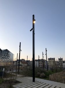 D’autres dispositifs ont été intégrés aux supports : caméra de surveillance, haut-parleurs, détecteurs de mouvement. De plus, les têtes des mâts, installés à chaque entrée de la place, comportent un balisage vertical qui signale le quartier Danton dans la nuit havraise.