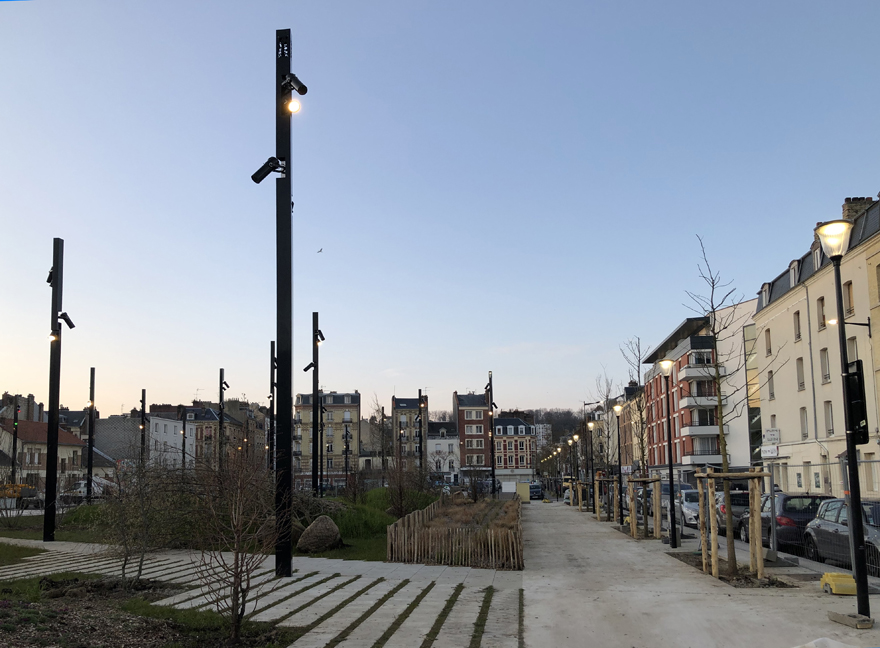 Les luminaires dédiés à l’éclairage d’ambiance présentent une température de couleur de 3 500 K, tandis que les appareils disposés sur les mâts de 9 m de haut, implantés dans la contre-allée qui longe le parc (pour le stationnement), offrent un éclairage un peu plus blanc, en 4 000 K.