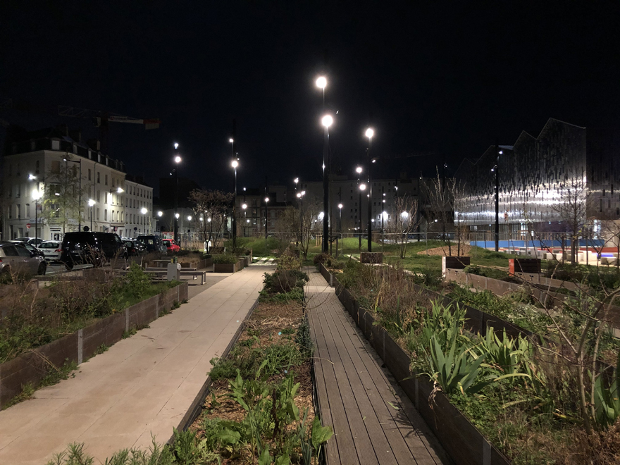 Dans ce contexte, le réaménagement du quartier Danton devait se doter d’une mise en lumière adaptée aux différents usages. « En plus d’assurer la sécurité des piétons, de hiérarchiser les espaces et d’indiquer l’identité visuelle de la ville, explique Akari-Lisa Ishii, conceptrice lumière, I.C.O.N., l’éclairage prend en compte le confort des usagers et les enjeux environnementaux dans un contexte de sobriété énergétique. » La place, entièrement végétalisée, est sillonnée de cheminements piétons qui relient la gare au centre-ville. Elle est ponctuée d’aires de jeux pour les tout-petits et d’espaces de repos et de détente pour les plus grands.