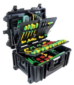 Grâce à des jeux de malles et de caissons sur trolley, le transport est facilité. Wiha a été le premier fabricant d’outillage à main au monde reconnu par le label AGR (Aktion Gesunder Rücken) e.V. Cette démarche qualité s’applique notamment au trolley XXL 3e génération. « Ce trolley est unique sur le marché puisque c’est la seule valise d’outils qui est conseillée par les médecins car elle répond à tous les besoins des professionnels sur un chantier. Les plateaux amovibles présents dans le coffret de 80 pièces XL et 100 pièces XXLIII sont conçus pour que tous les outils soient accessibles de manière rapide et simple. C’est possible grâce à une disposition en éventail des plateaux individuels avec des espaces intermédiaires largement dimensionnés. L’électricien peut ainsi accéder confortablement aux outils et prélever ou remettre rapidement l’outil utilisé. Le trolley XXL est équipé de vérins qui maintiennent le couvercle dans différentes positions et empêchent qu’il se referme. Mais il est bien plus puisqu’il sert de marchepied, de règle à mesurer, de plateau pour découper, de tabouret pour manger », ajoute Jérôme Layer.