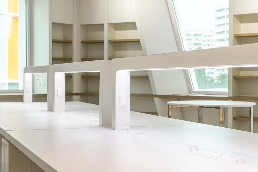 Clareo a fourni pas moins de 7 000 luminaires, allant des encastrés Panel aux lignes lumineuses LineLED, en passant par les downlights de circulation. Les « arches lumineuses » ont été conçues et développées sur mesure par Clareo. Fabriquées en France, leurs tailles ont été adaptées directement aux dimensions des tables de la bibliothèque de la Sorbonne, le tout avec un design innovant et résolument moderne. Au total, Clareo a fourni plus de 100 arches lumineuses sur mesure.