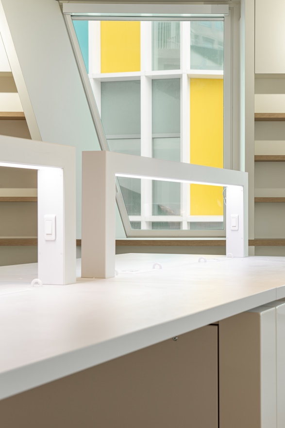 - des downlights encastrés Insaver Slim (5 000 lm) au plafond de l’amphithéâtre Friedel, des réglettes en lèche-mur qui assurent l’éclairage en corniche ainsi que des luminaires Rana asymétriques (1 200 x 300 mm) au-dessus des tableaux ;