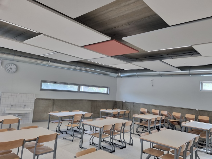 « Dans ce contexte, explique Raynald Vilaine, responsable prescription, Ridi, le bureau d’études ITUD a fait appel à nous pour nos luminaires maintenables et réparables. De plus, l’architecte souhaitait des luminaires très fins, intégrés dans les plafonds, quel que soit le type de plafonds. Certaines salles de classe comprennent les plafonds modulables (photo du haut) où il était facile d’installer nos luminaires et d’autres des panneaux acoustiques de couleur suspendus (photo du bas). L’idée de l’architecte était de positionner les luminaires d’une façon qui paraisse aléatoire. »