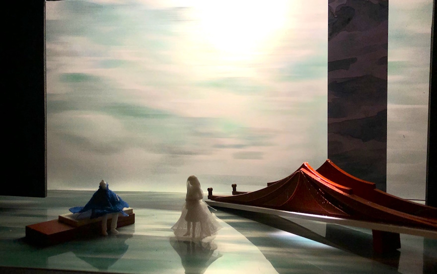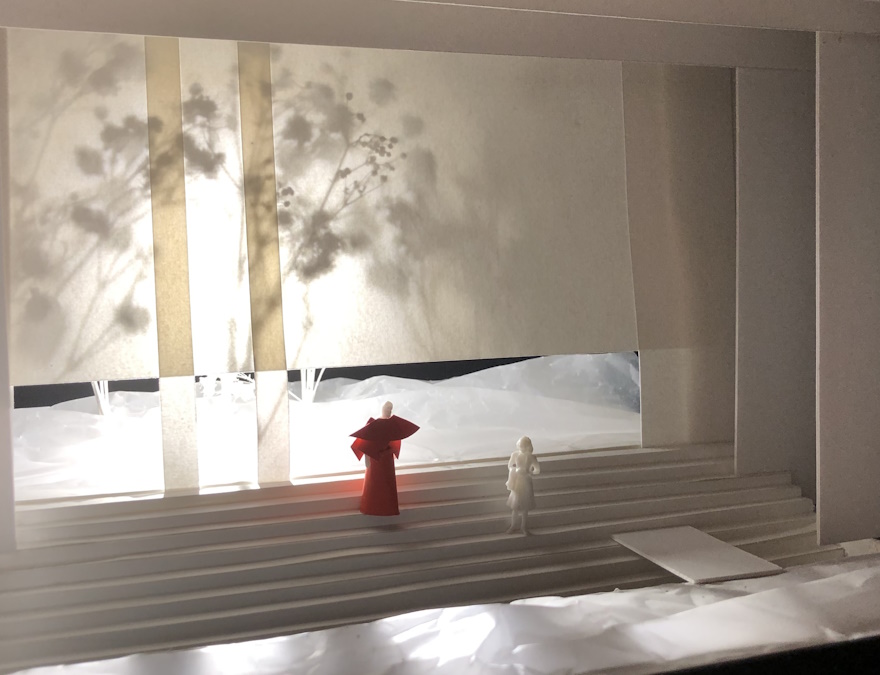 La maquette a été conçue pour donner une image contemporaine de l’empire de Chine. J’ai repris l’escalier de la Cité interdite que j’ai replacé au centre de la scène. Tout le décor est monochrome et apparaît en nuances de blanc créées par les effets lumineux (rétroéclairage, ombres chinoises, etc.). C’est la lumière qui apporte la couleur par des gélatines disposées sur des panneaux qui changent à l’arrière du décor. À la fin, au moment où l’empereur revit et que le rossignol chante, l’architecture du palais et la nature se mélangent. Et cette association d’harmonie et de sentiment de chaleur se retrouve dans les deux personnages : l’empereur, habillé d’un tissu rigide flamboyant et le rossignol, recouvert d’un tissu très souple et clair, tous deux éclairés d’une douce lumière blanche.