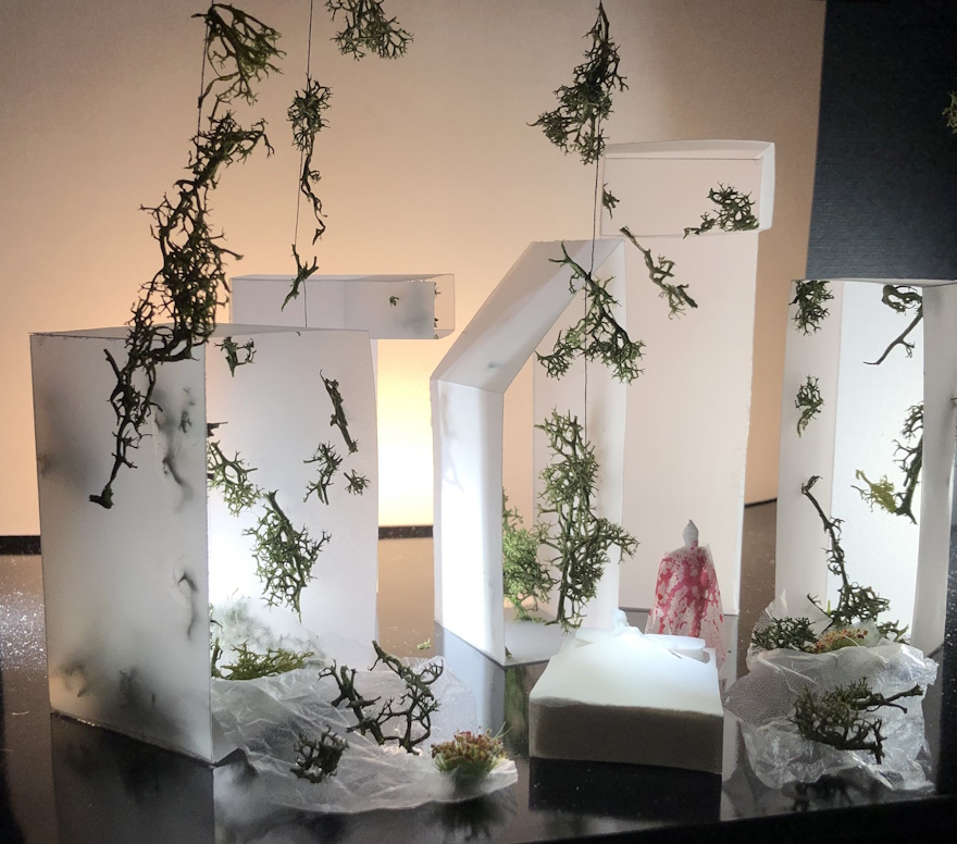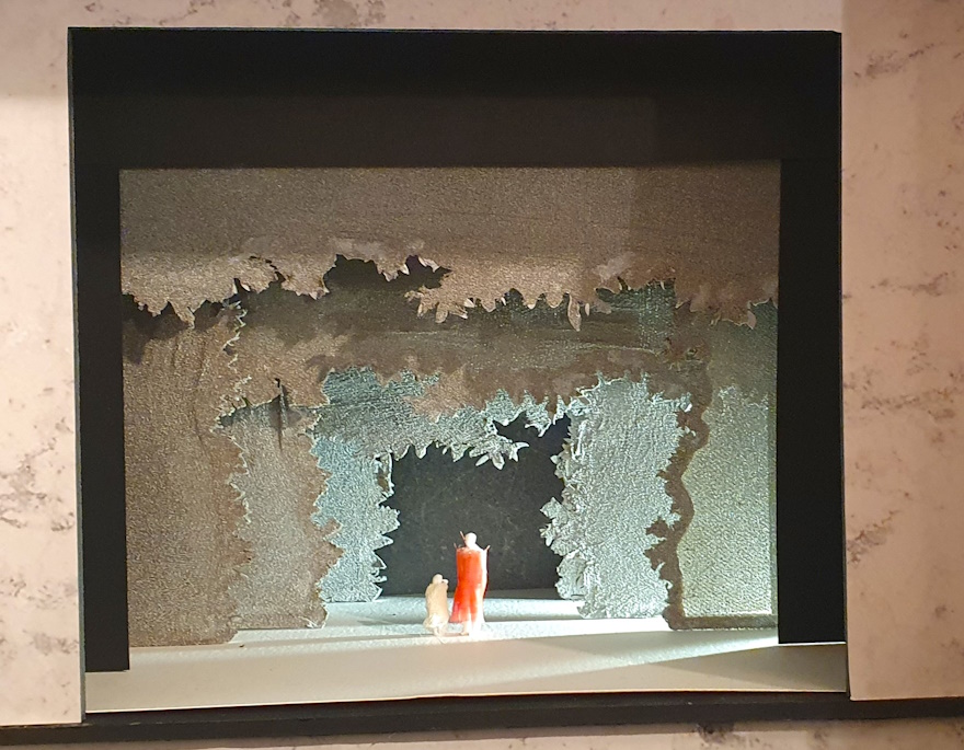 J’ai pris conscience, au cours de ces trois années à l’École Bleue, de l’importance de la lumière dans la scénographie, et les matériaux que j’ai choisis pour créer mon décor et mon univers dans la maquette sont spécifiquement pensés pour réagir à la lumière. J’ai utilisé le tulle qui présente une particularité : éclairé de face, il est totalement opaque, et éclairé de côté, il devient translucide. Le tulle m’a permis de créer un décor moderne inspiré du théâtre baroque qui fait appel à beaucoup de panneaux peints. J’ai commencé par représenter une nature inhospitalière et dense qui disparaît petit à petit pour laisser place à une forme de poésie avec des jeux d’opacité et de transparence créés par la lumière. Ainsi, pendant l’opéra, plusieurs tonalités de lumière se succèdent, plusieurs éclairages sont proposés afin d’accentuer le propos et la musique. C’est juste l’éclairage qui permet une compréhension différente de l’environnement en jouant sur les couleurs et l’orientation de la lumière.