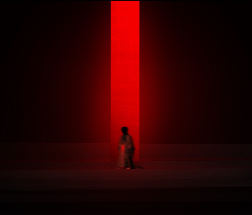 J’ai caractérisé les contrastes du récit par trois petites vagues qui montrent l’envol du rossignol vers sa liberté et le chemin de l’empereur vers la mort, vers cette grande ligne rouge. Dans le premier acte, j’ai caché deux vagues pour laisser du suspense et j’ai utilisé des lumières plutôt rasantes et bleutées, un peu vertes. Dans l’acte II, je dévoile les trois vagues et pose un toit qui évoque l’enfermement ; les couleurs sont crème, orangées et les lumières blanches qui illuminent littéralement le décor. Cette lumière devient rouge à l’acte III : elle représente la mort, mais aussi la puissance de l’empereur qui assure son pouvoir, tandis que l’arrivée du rossignol est caractérisée par une lumière blanche qui symbolise la pureté, la liberté et qui prend le contrôle sur la lumière rouge à la toute fin de l’acte.