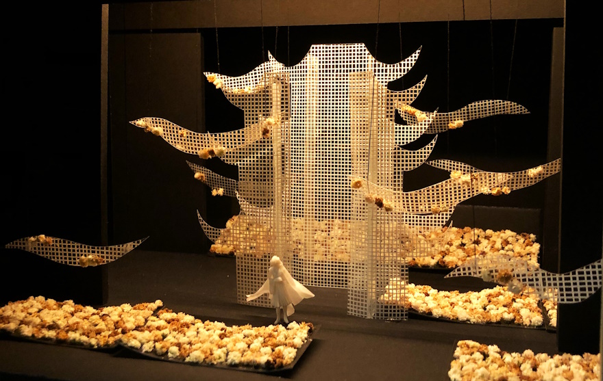 La maquette concrétise le conflit du récit par les matières utilisées qui s’opposent : le tissu (les fleurs disposées au sol sur le devant de la scène) et le grillage qui, dans le dernier acte, s’unissent pour illustrer l’harmonie retrouvée. La lumière a permis de révéler ces contraires, par exemple en mettant l’accent sur le grillage à l’aide d’ombres portées. J’emploie la lumière de façon plutôt douce et dans ce dernier acte justement, elle revêt une teinte chaude qui évoque avec délicatesse le crépuscule de la vie. Dans la construction de la maquette, ma réflexion s’est faite en même temps sur le choix des matériaux et celui de la lumière. Les essais ont ensuite permis d’ajuster les effets lumineux afin qu’ils correspondent à ce que j’imaginais. M’imprégner de la musique m’a beaucoup aidée à retranscrire la perception que j’avais de l’histoire elle-même et de sa scénographie.