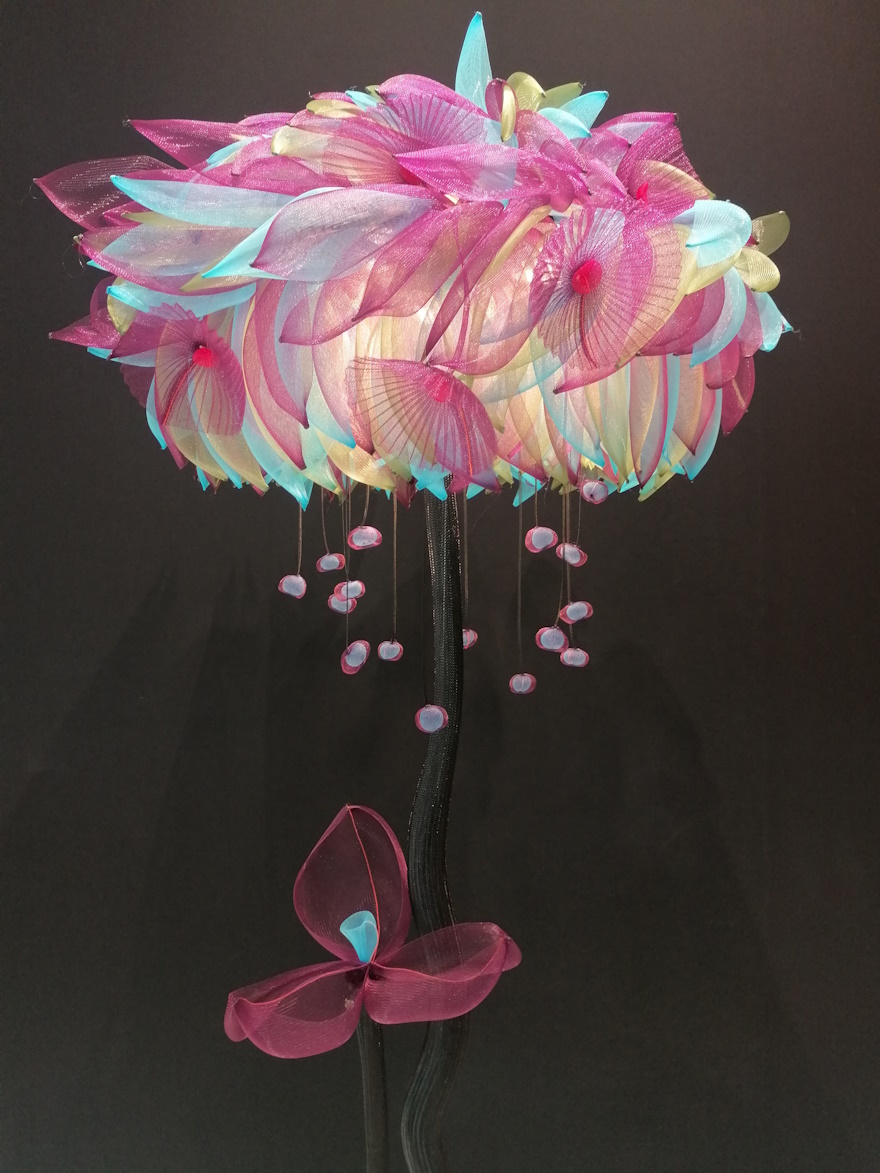 Lampadaire de 2,20 m de haut. Le pied est composé d’un socle acier noir de 38 cm de diamètre, avec, en son centre, un tube acier de 2 m de haut habillé d’une gaine technique textile lui conférant l’aspect d’un tronc. La structure lumineuse est composée d’un pavillon avec 3 douilles E27 pour 3 x leds de 10 W, 220 V. La partie feuillage de l’arbre, ou abat-jour, est constituée de grandes feuilles, de fleurs, de graines, cousues sur une base textile. Cette sculpture, en résille polyester, a un diamètre de 95 à 100 cm. À la base de l’arbre, pousse une tige de fleur.
