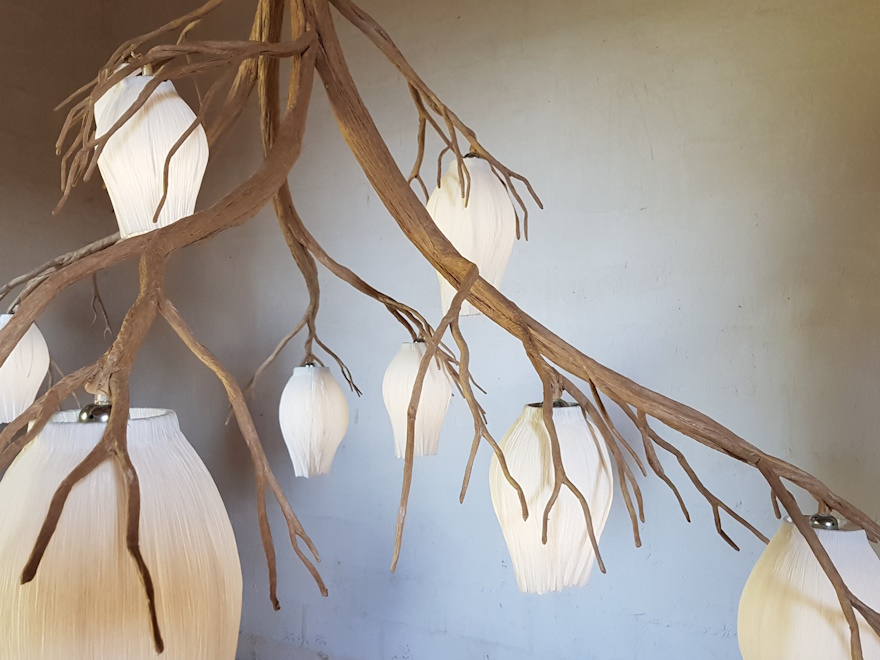 Douze Gouttes est un lustre suspendu par câbles en acier. Armature interne en tubes acier cintrés et soudés. Habillage de papier kraft compressé et encollé avec des effets de branchages et traité anti-feu.