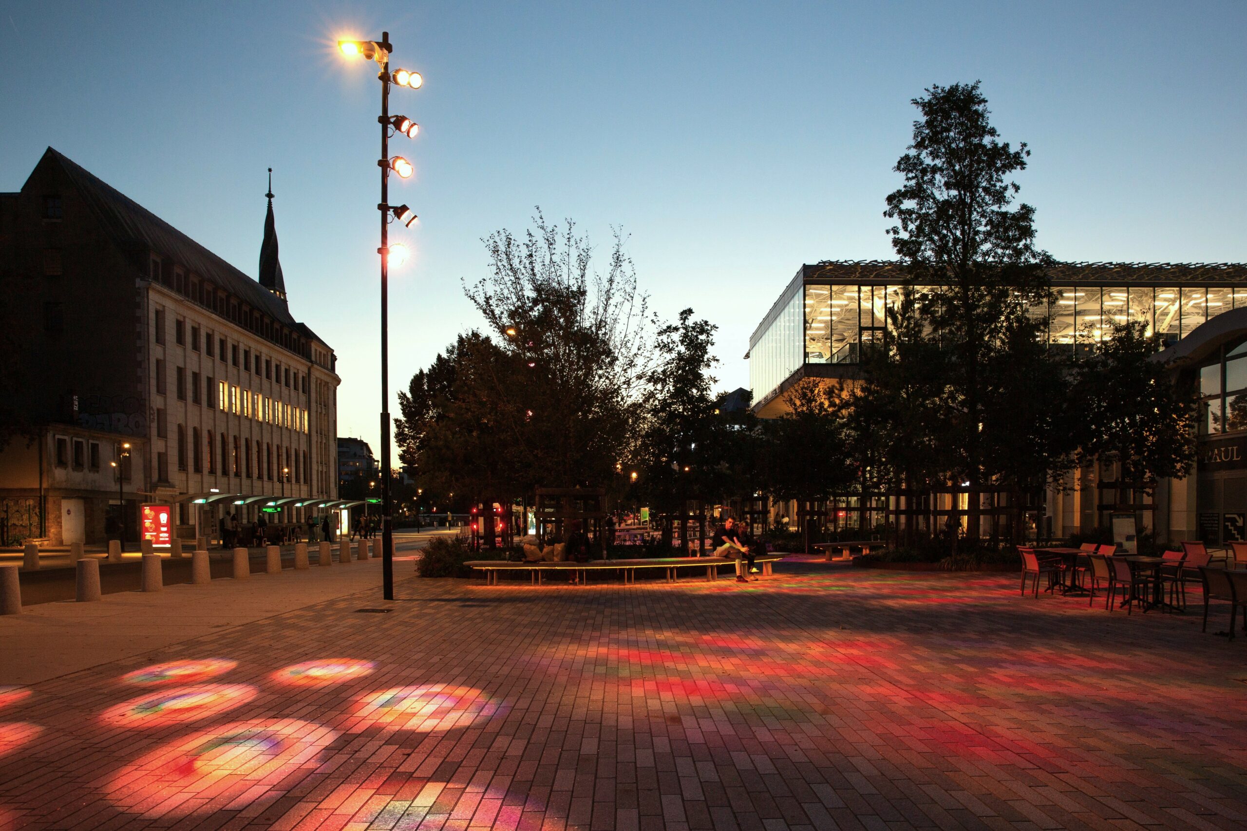 «Nous nous sommes inspirés d’un travail réalisé par nos confrères de Concepto à Saclay, commente Florian Colin, en utilisant un verre spécifique et une lentille de Fresnel. Notre composition chromatique se déploie sur le parvis, en vert, rouge et bleu, dans des pastels de plus en plus flous au fur et à mesure que l’on s’approche de la gare. Dans les espaces de repos, les couleurs sont plus marquées et plus chaleureuses ». L’Atelier Ruelle a dessiné des bancs de pierre qui intègrent un rétroéclairage en sous-face des assises, ainsi que des tables de salon, en pierre également, qui invitent les voyageurs à faire une pause sur la place.