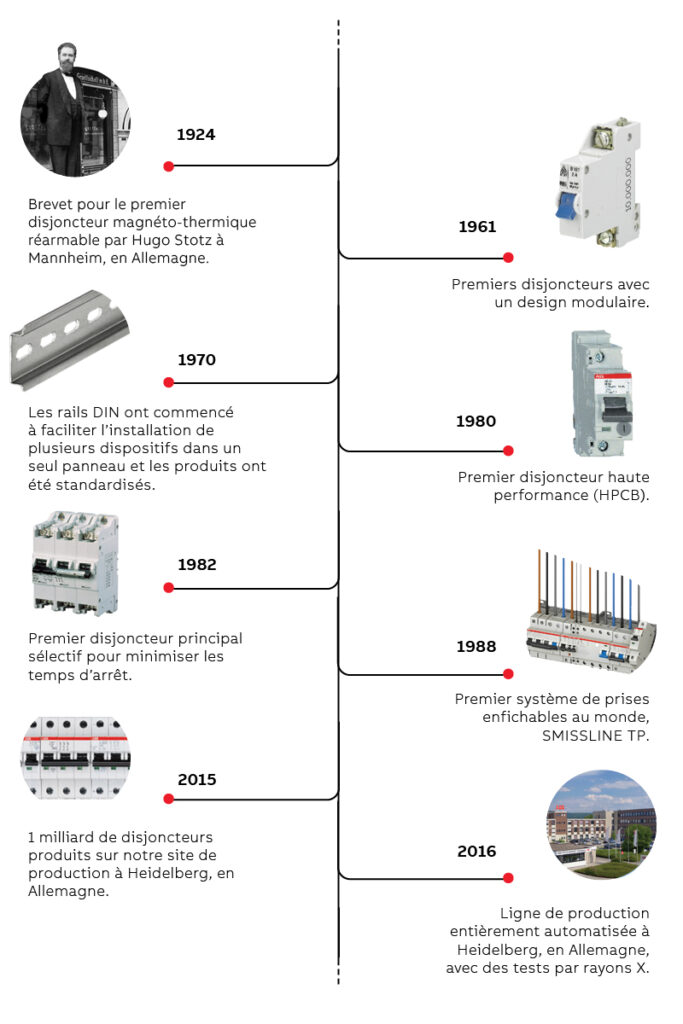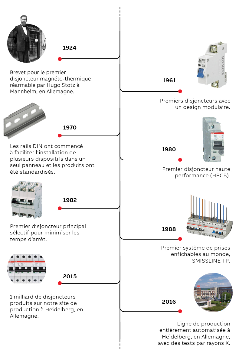 En 1918, le prédécesseur d’ABB, Brown, Boveri & Cie (BBC), a racheté Stotz Kontakt, une entreprise de matériel électrique basée à Mannheim, en Allemagne. Le fondateur de l’entreprise, Hugo Stotz, est resté chez BBC et, en collaboration avec son ingénieur en chef, Heinrich Schachtner, a inventé le premier disjoncteur miniature à réenclenchement, un dispositif breveté en novembre 1924.