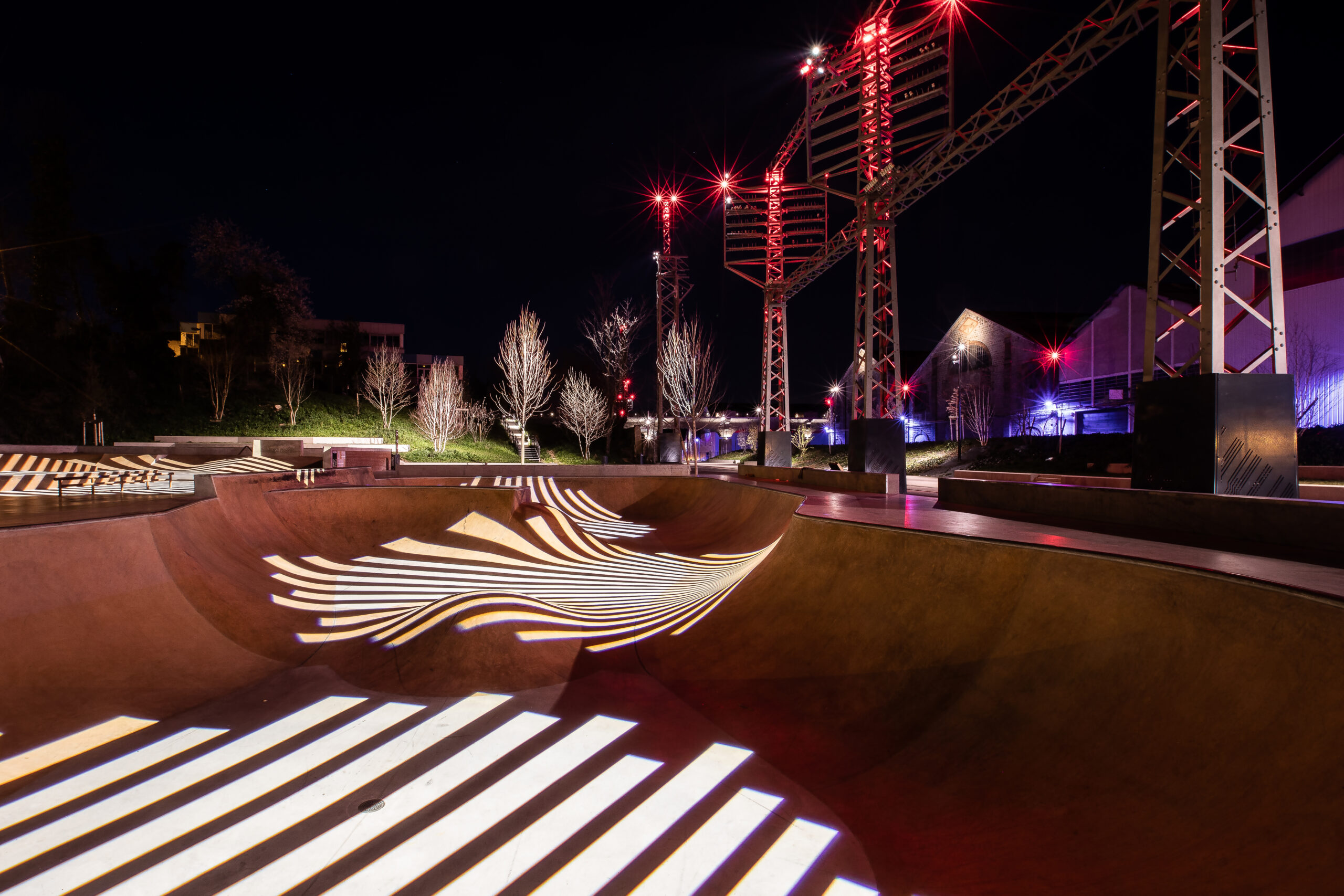 Lucas Goy – Oui, dans mon parcours et dans le travail de l’agence, il y a toujours une part de recherche et développement, de nouveaux procédés. Ainsi, l’invention se glisse dans nos projets dans des petites choses très subtiles mais ce sont des grands pas en avant. C’est pour cette raison que d’une manière générale, je n’ai pas l’impression d’avoir une écriture spécifique. Je pense que c’est le design et le contexte qui nous guident et nous conduisent à des inventions qui sont présentes dans chacun de nos projets. Le premier bâtiment sur lequel j’ai travaillé m’a été confié par le cabinet d’architecture Patriarche pour éclairer Le Phare à Chambéry, une salle multifonctionnelle de 6 000 places qui accueille des concerts, des spectacles et des manifestations sportives. Cela concernait l’espace d’accueil du public, l’atrium, le proscenium qui fait le tour de la salle, les circulations extérieures. C’était le premier projet que j’ai programmé en DMX ! La conception lumière, c’est beaucoup de travail, cela ne peut pas s’improviser. On peut avoir les plus belles idées au monde mais si on ne sait pas faire d’études photométriques, on ne peut pas avancer. C’est aussi un métier de technicien que le nôtre. Notre équipe a capitalisé un certain nombre de savoir-faire très importants, par exemple interpréter correctement les règles d’accessibilité PMR, comprendre les normes, connaître les textes règlementaires ; ce n’est qu’en maîtrisant les contraintes que l’on peut le mieux s’en affranchir, s’en libérer.