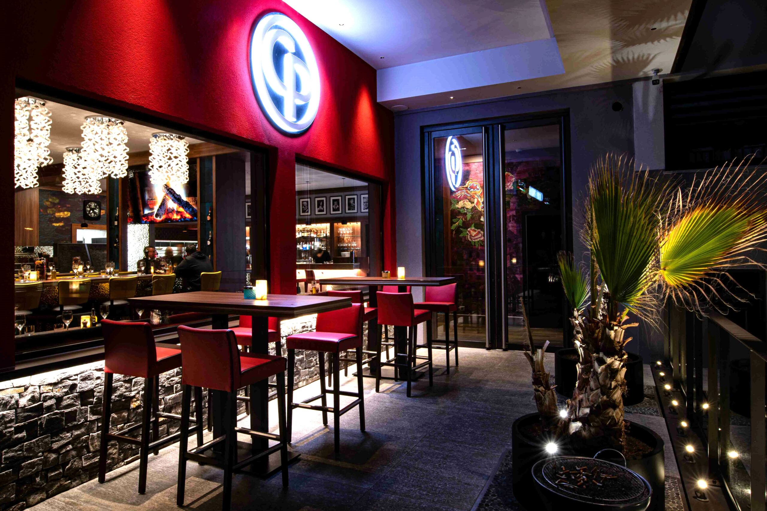 Sur la terrasse, les lettres de l’enseigne du restaurant « C et P » s’entrelacent dans une lumière blanche sur fond bleu foncé, le tout apposé sur le mur rouge.
