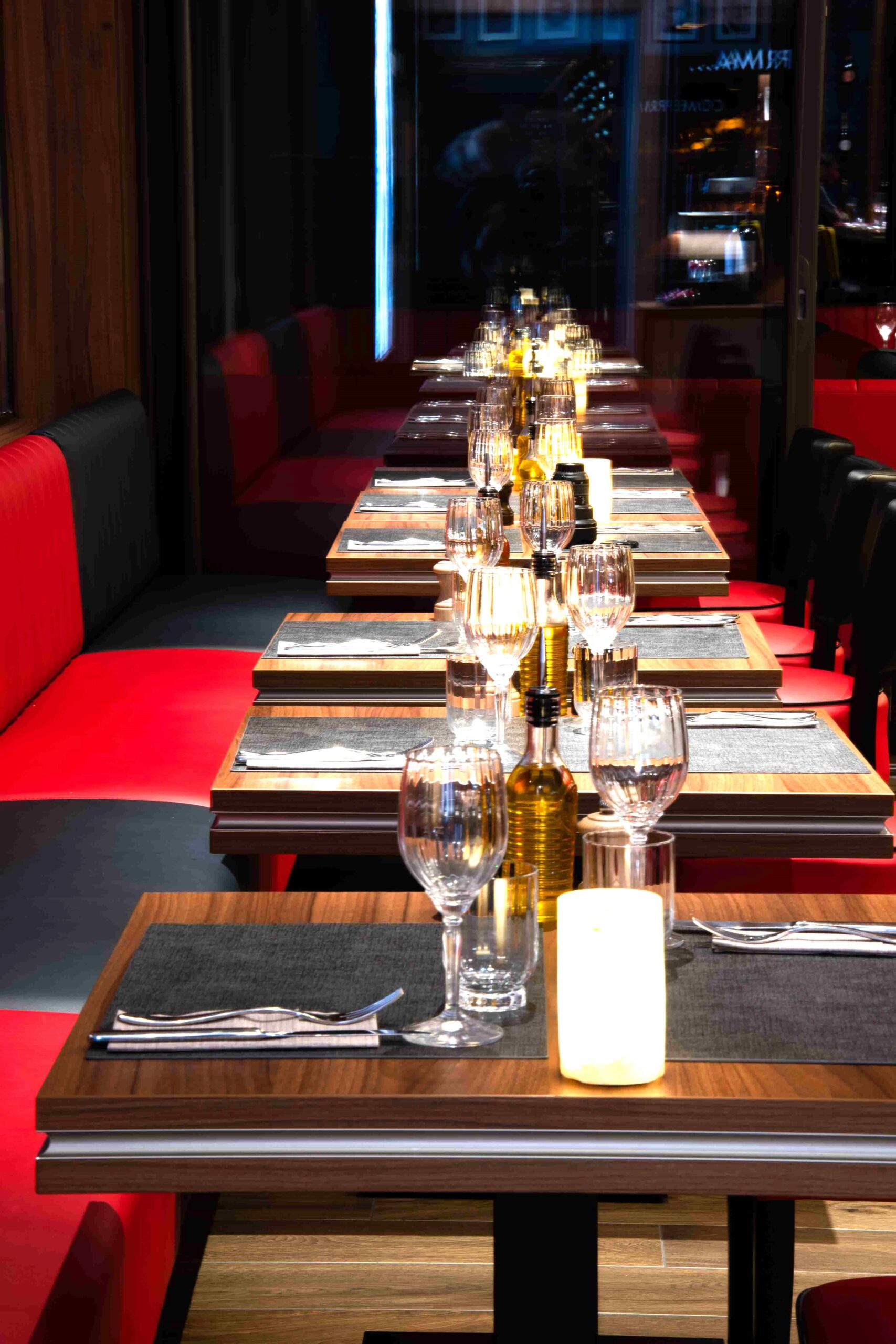 Les tons sont chauds : le rouge se marie avec le doré qui s’harmonise avec le bois. Afin de conserver cette atmosphère, tous les luminaires affichent une température de couleur de 2 700 K, accompagnée d’un indice de rendu des couleurs de 90 (R9 supérieur à 80) qui met en valeur les matériaux et le contenu des assiettes.