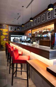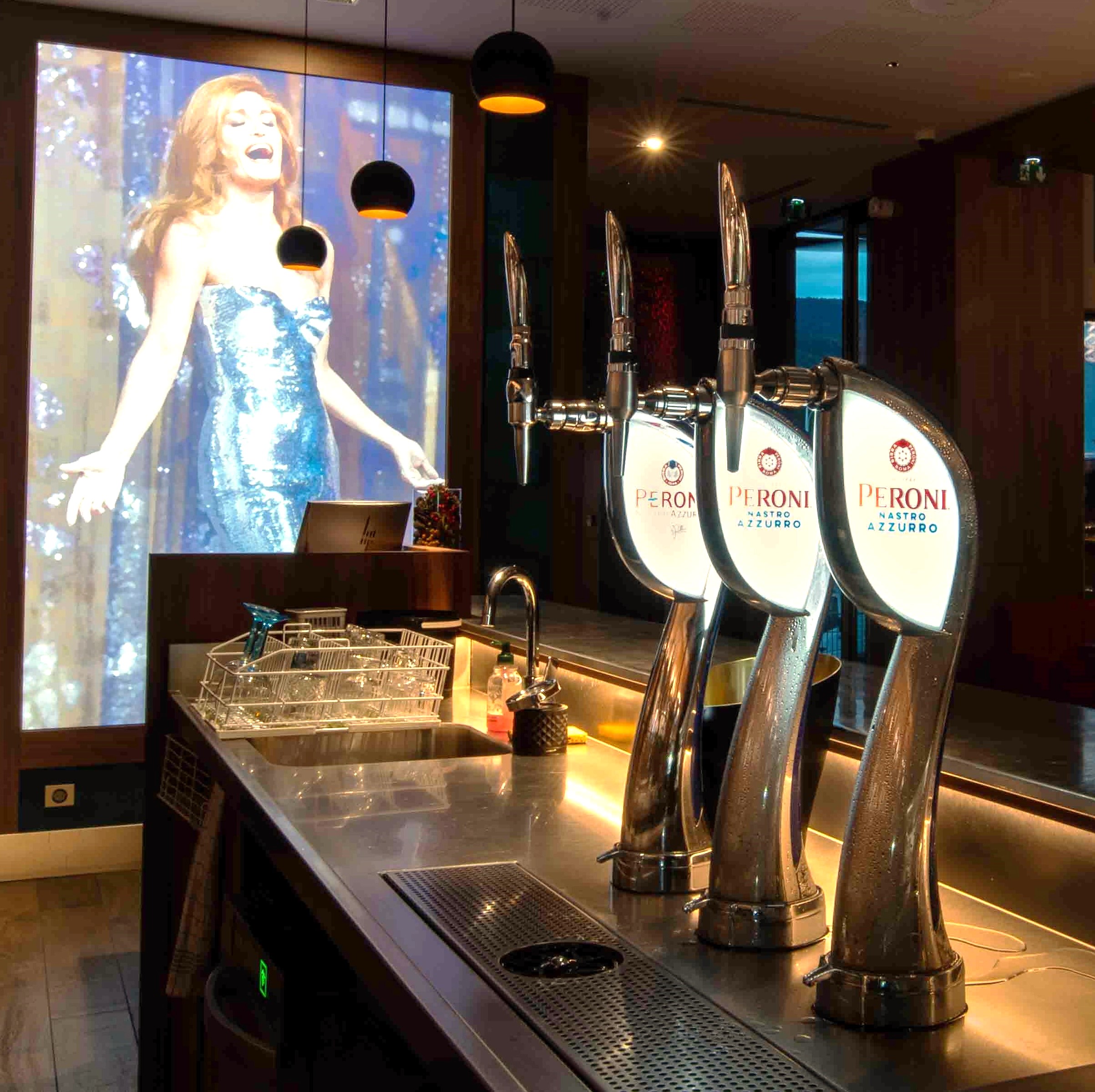 Des suspensions sphériques noires descendent au-dessus du bar pour éclairer le comptoir tandis que des micro-projecteurs (1 cm de diamètre et 2 cm de long) ont été orientés sur les bouteilles à l’arrière. Le comptoir lui-même est rétro-éclairé par un ruban led en sous-face.