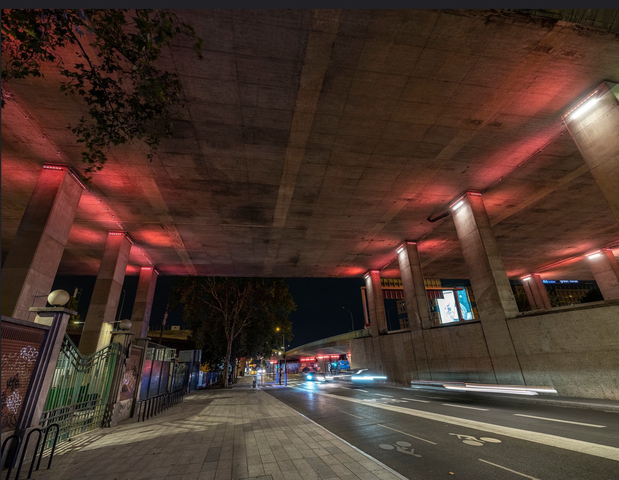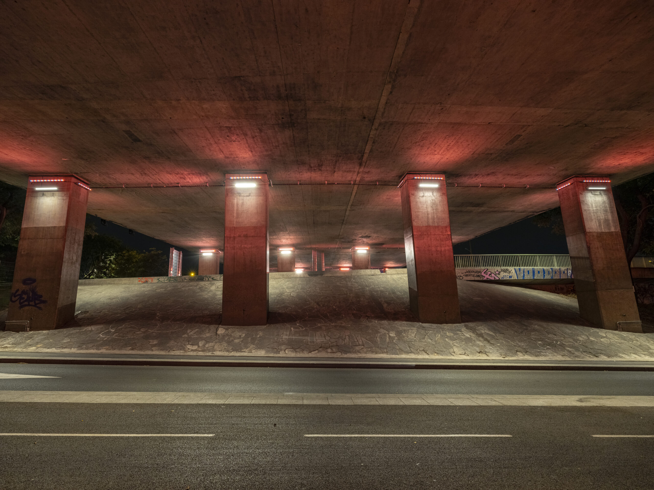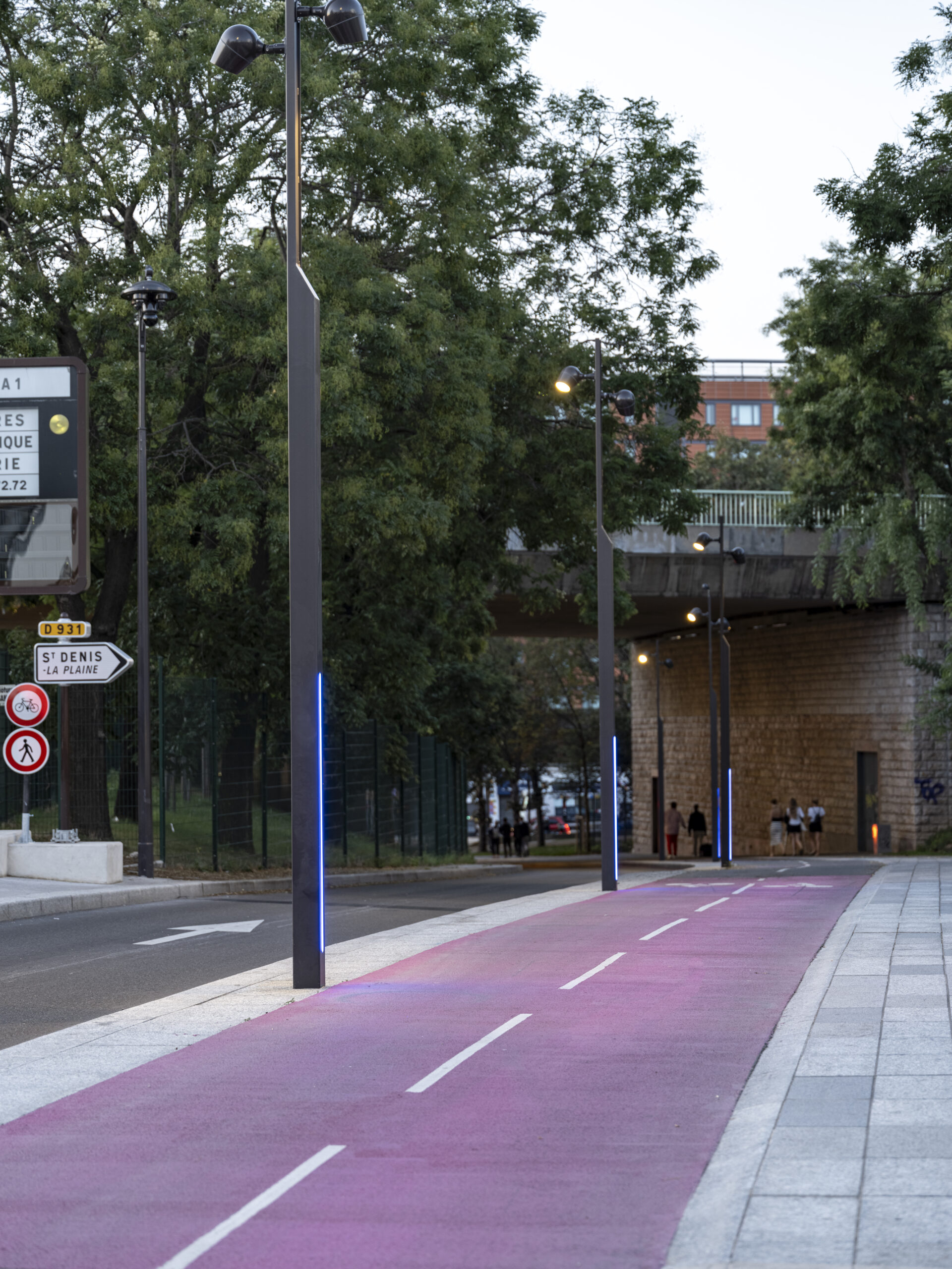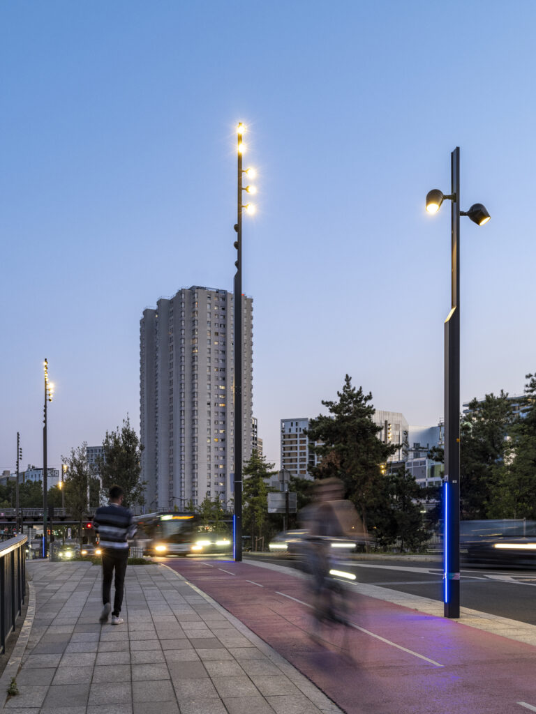 L’équipe de Concepto a donc abordé le projet par le prisme confortable de la lumière. Cependant, dans un tel nœud de circulation, l’aspect fonctionnel de l’éclairage tenait une place importante. Souhaitant conserver une certaine harmonie avec la mise en lumière de l’esplanade Alice-Milliat réalisée par 8’18’’ (tandis que l’Arena a été mise en lumière par Philippe Almon), Concepto a repris la même modénature de mâts mais pas les mêmes projecteurs. Ces derniers sont disposés à des hauteurs différentes de manière à fournir de la lumière partout où cela est nécessaire et a même intégré, en pied de mât, des lignes verticales bleues dédiées à l’éclairage des circulations piétons et pistes cyclables. Cet éclairage fonctionnel du nouvel aménagement, destiné à apaiser et simplifier la lecture de l’espace par le piéton, est complété par une mise en lumière « expérientielle » colorée des tabliers sous les ouvrages d’art.
