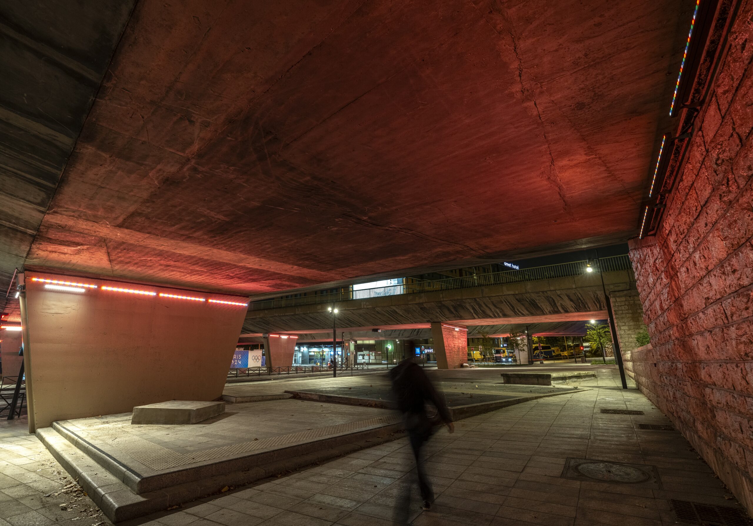 Les linéaires sont placés en haut des piles et piliers, créant un éclairage patrimonial pastel doux sur le « plafond » du passage, surnommé la « cathédrale » au niveau de l’arrêt de bus de la ligne 38.