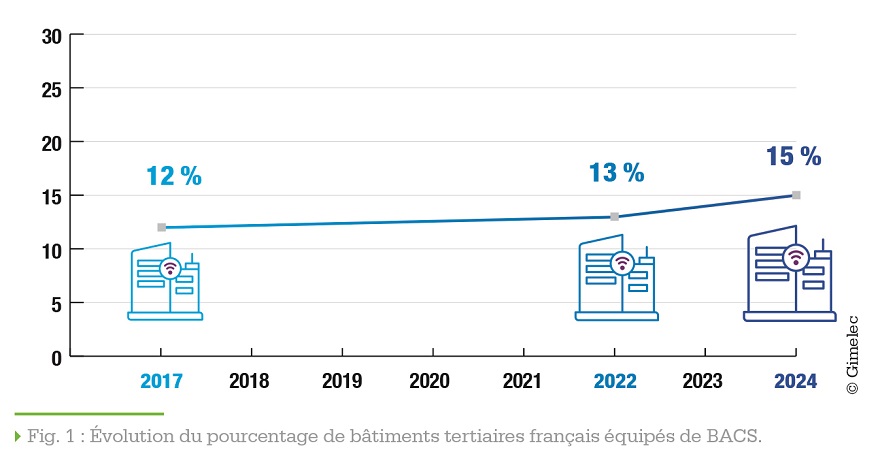 Le premier chiffre qui ressort de cette étude est que seuls 15 % des sites tertiaires sont aujourd’hui équipés de BACS. Un déploiement qui n’est pas à la hauteur des objectifs de la réglementation française et européenne.