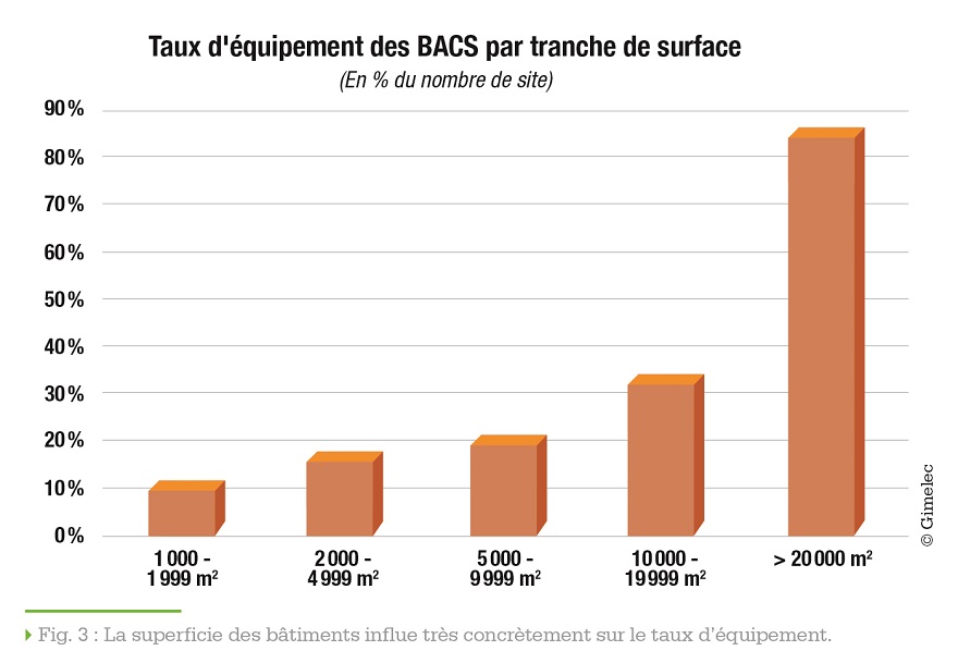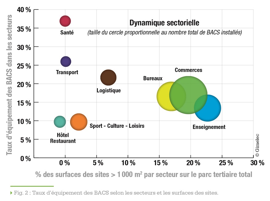Plutôt précurseurs, les sites de santé comme les hôpitaux et ceux de transport, les gares, se sont dotés de BACS (> 30 %) sans attendre la réglementation, pour des impératifs de continuité de service, de performance énergétique, d’optimisation, ou encore de confort des usagers. Il faut également souligner l’effet très positif de la fiche CEE BAT-TH-116 et de son bonus temporaire sur les décisions d’investissements dans des BACS et le déclenchement des démarches d’efficacité énergétique associées.