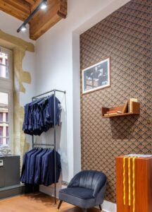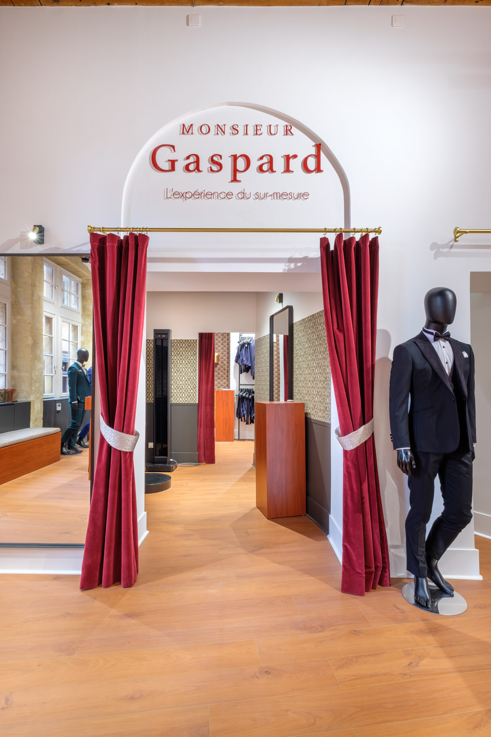 La marque utilise une technologie unique : en 1 minute, une cabine 3D permet d’étudier la morphologie des clients, puis des stylistes les aident à choisir les tissus et à définir la coupe idéale. Elle a ouvert une autre boutique, la troisième, en transformant d’anciens bureaux lyonnais. Monsieur Gaspard a fait appel à une architecte d’intérieur, Gwenola Meuzeret, La Baronne d’Intérieur, qui a eu carte blanche pour sublimer les lieux. Elle s’inspire du velours rouge (déjà utilisé dans les boutiques Monsieur Gaspard) et de l’univers du vêtement, du bois des futurs meubles et de l’univers du vêtement pour hommes afin de créer une décoration tout en élégance. Des papiers peints, par exemple, rappellent ponctuellement les pochettes des costumes masculins. Certains mannequins sont placés à plus de 3 m du sol sur des meubles dessinés spécifiquement par l’architecte. Gwenola Meuzeret souhaitait mettre toute cette décoration en valeur et surtout, souligner les tissus. « Les clients avaient de véritables exigences sur la mise en valeur des produits. J’avais besoin d’une vraie performance sur le rendu colorimétrique », explique la directrice de La Baronne d’Intérieur.