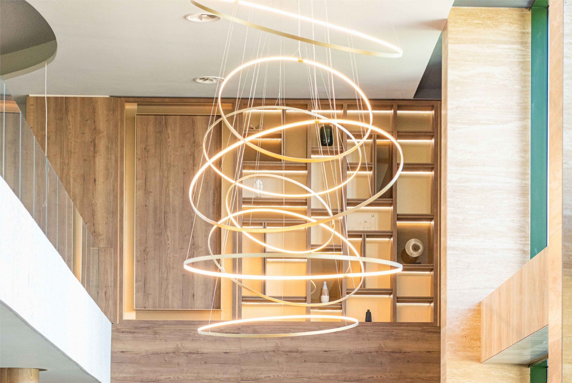 Les luminaires Brooklyn Round, utilisés dans une composition de lignes courbes semi-encastrées qui se croisent en certains points, s’alternent avec les anneaux Zero Round de différents diamètres suspendus à des hauteurs distinctes. Avec leurs profils leds sinueux et raffinés, Brooklyn Round et Zero Round créent un cadre confortable pour un moment de détente, une conversation agréable ou un verre entre amis.
