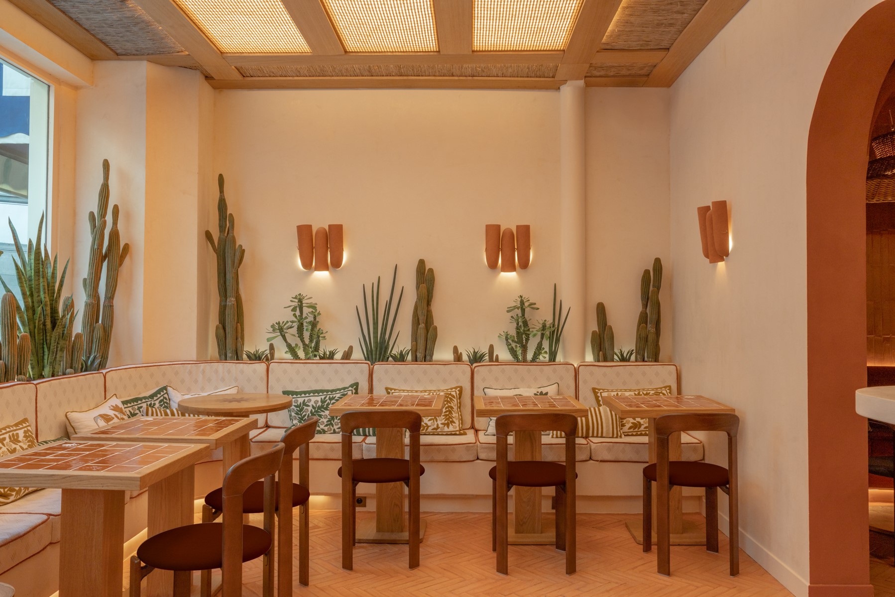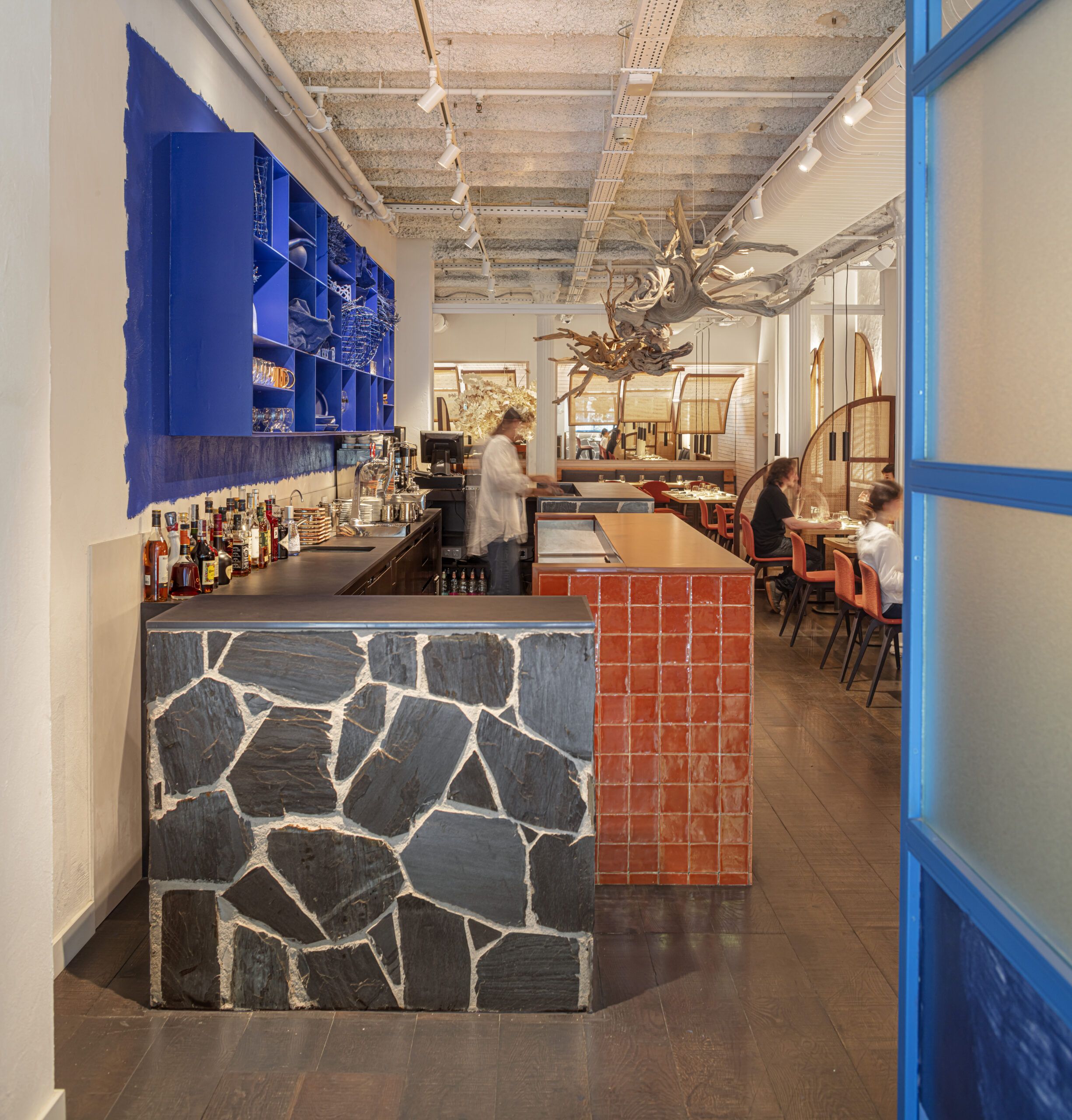 Le restaurant Compartir a ouvert en 2022 dans le quartier d’Eixample, à Barcelone. Au sein d’un bâtiment du début du XXe siècle, avec piliers intérieurs en fonte, El Equipo Creativo, agence de décoration intérieure, signe un projet rendant hommage au village de Cadaqués. Village le plus oriental de la Costa Brava, Cadaqués est l’un des plus pittoresques d’Espagne, où ont vécu longtemps Salvador Dali et son épouse Gala. C’est aussi le village où les propriétaires de Compartir ont ouvert leur premier restaurant, duquel ils sont partis et qu’ils veulent rappeler.