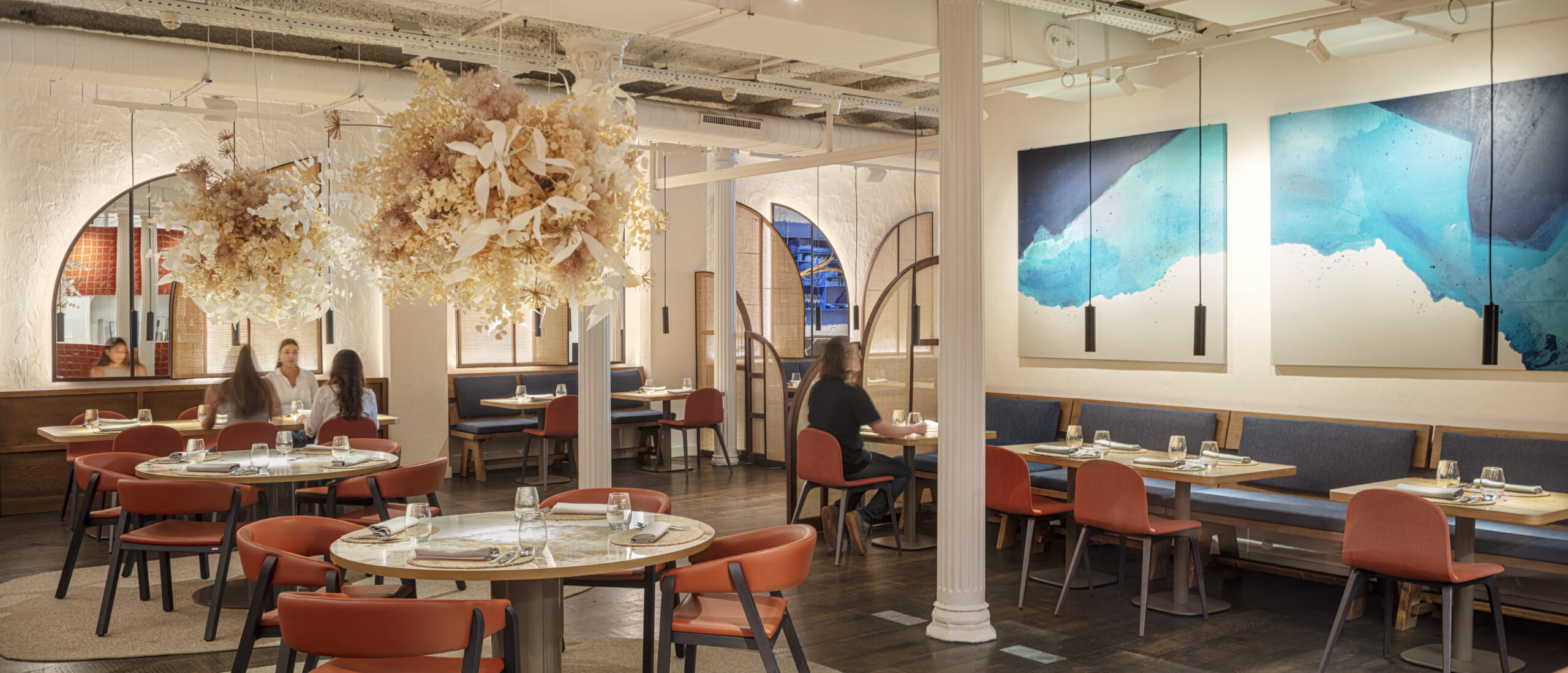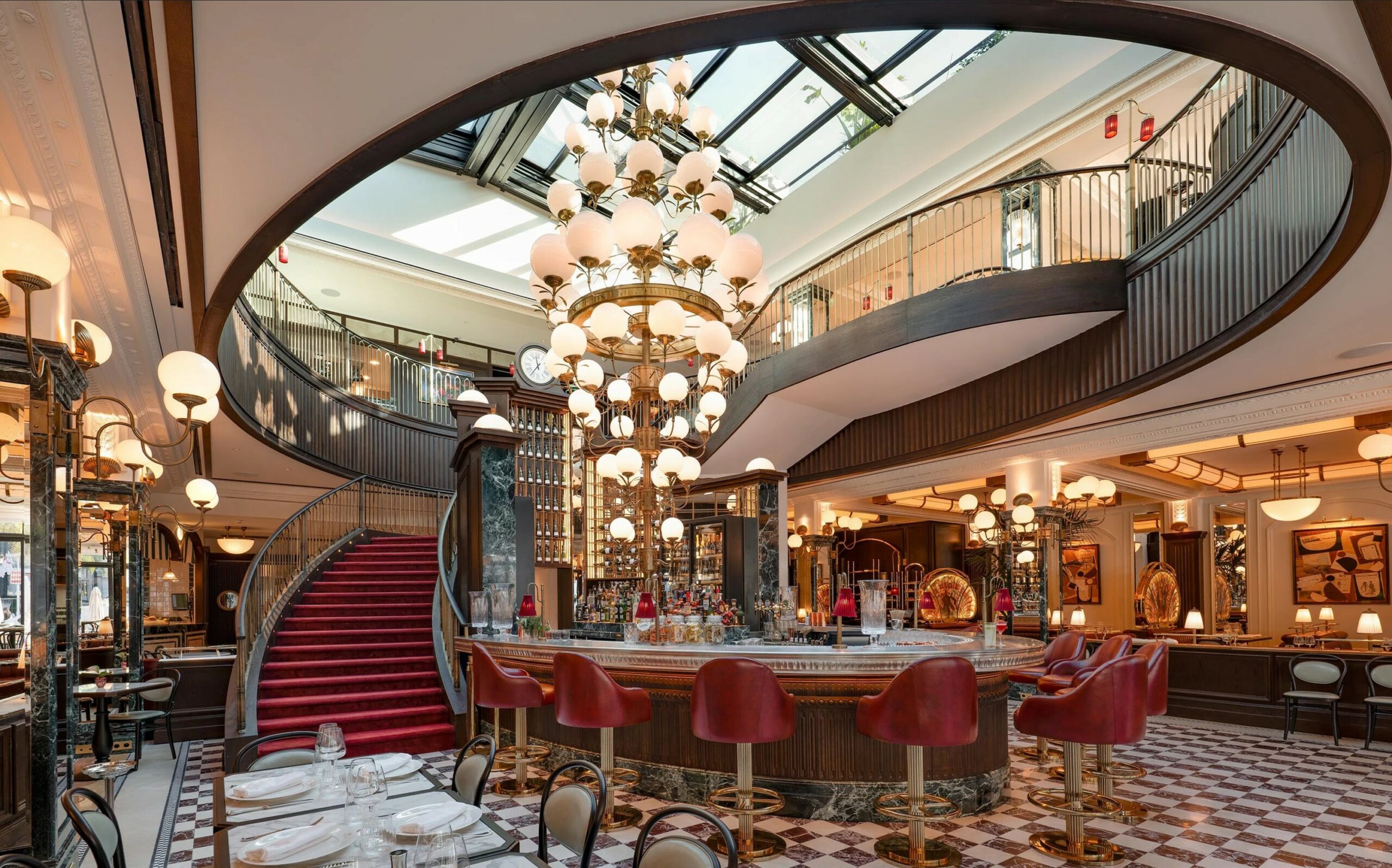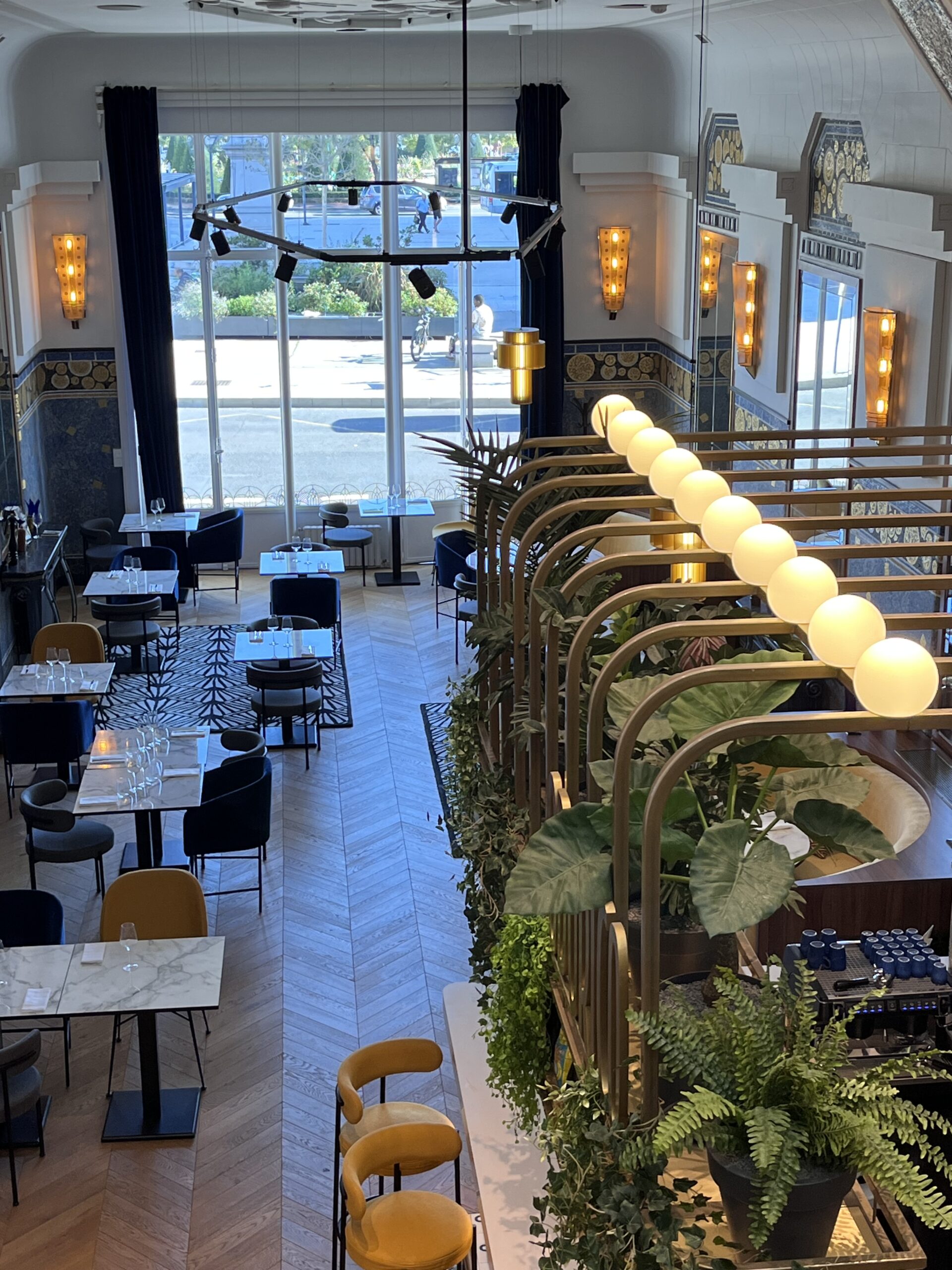 Les lustres d’origine ont été envoyés en Italie pour être remis en état et modernisés. Le mobilier contemporain et coloré a été choisi pour s’harmoniser avec les teintes dominantes des mosaïques. Moulures, miroirs, parquet et espace bar végétalisé complètent ce mix entre patrimoine artistique et design.