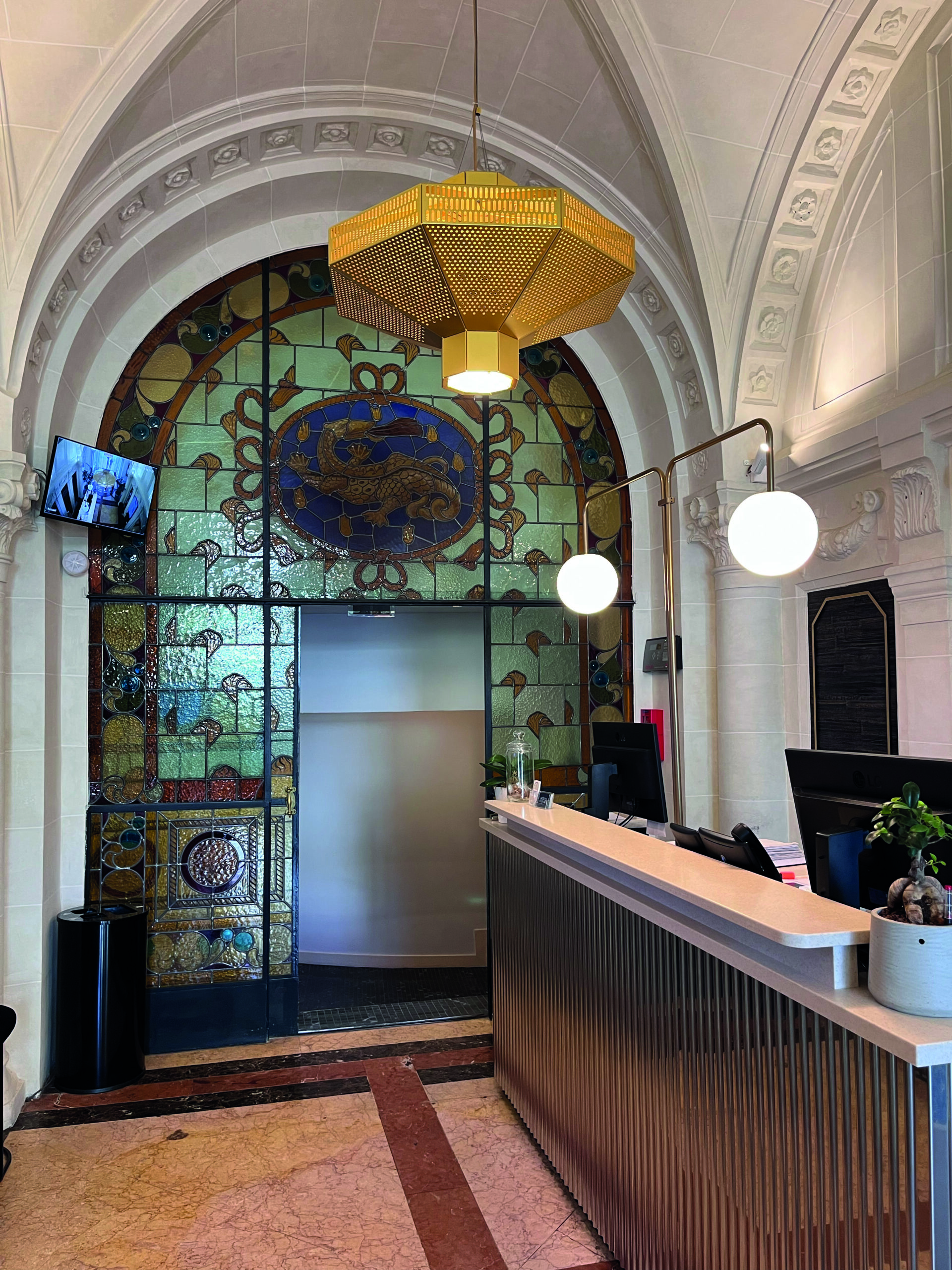 La salle des banquets est alors coiffée d’une mezzanine éclairée par une sublime verrière Art déco et les murs se parent de mosaïques aux dominantes bleues et or : œuvre du mosaïste rennais Isidore Odorico. Avant d’être repris par le groupe familial Oceania Hotels en juin 2024, l’établissement quatre étoiles est alors entièrement rénové. Près de douze mois de travaux ont été nécessaires pour redonner à l’endroit son éclat raffiné.