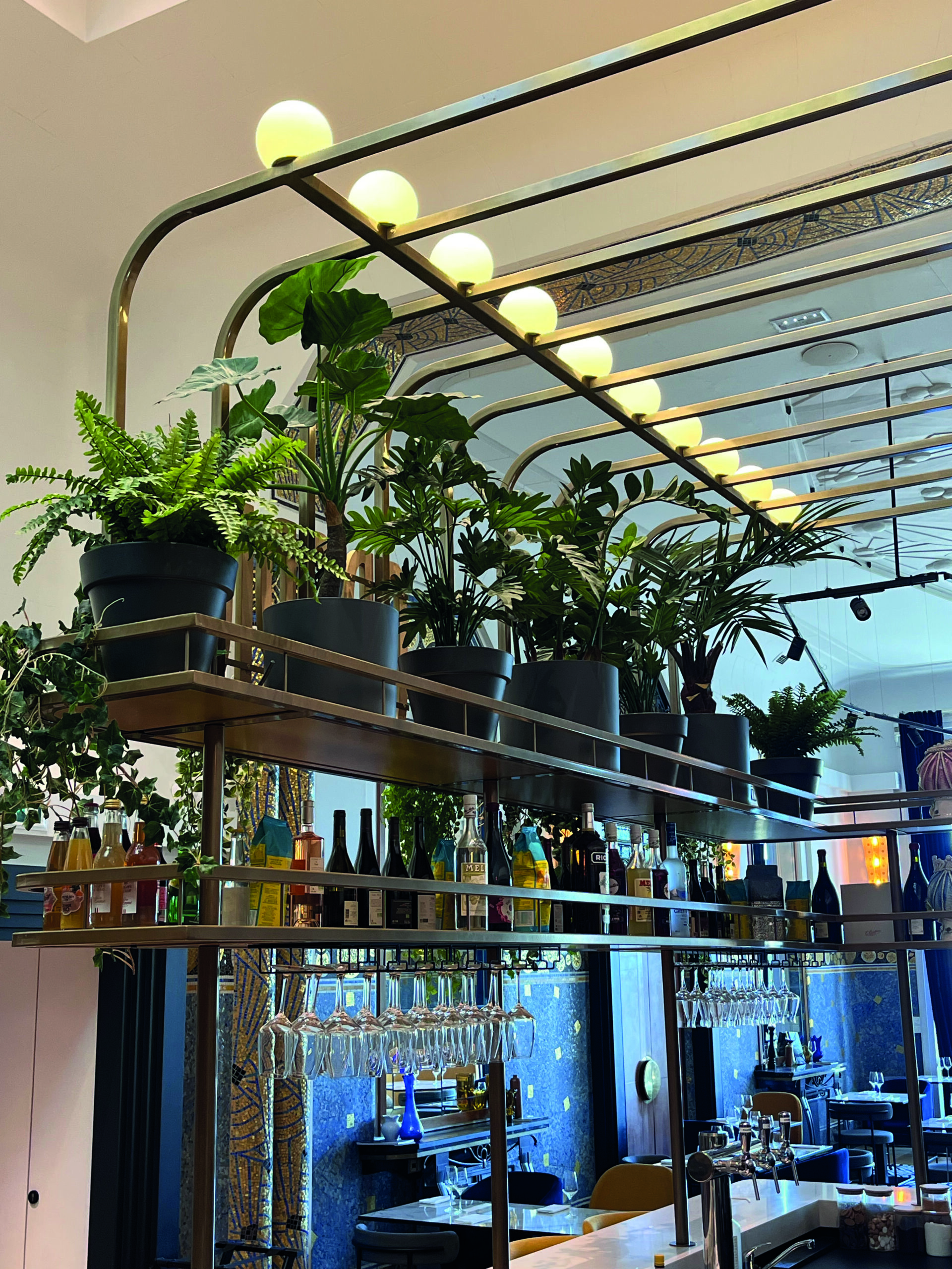 Le bar du restaurant, quant à lui, arbore dans une finition laquée les lettres du nom « Odorico ». Il est surmonté d’une grille de style Art déco, coiffée en son sommet végétalisé d’une dizaine de globes en verre opale blanc pour illuminer l’ensemble.