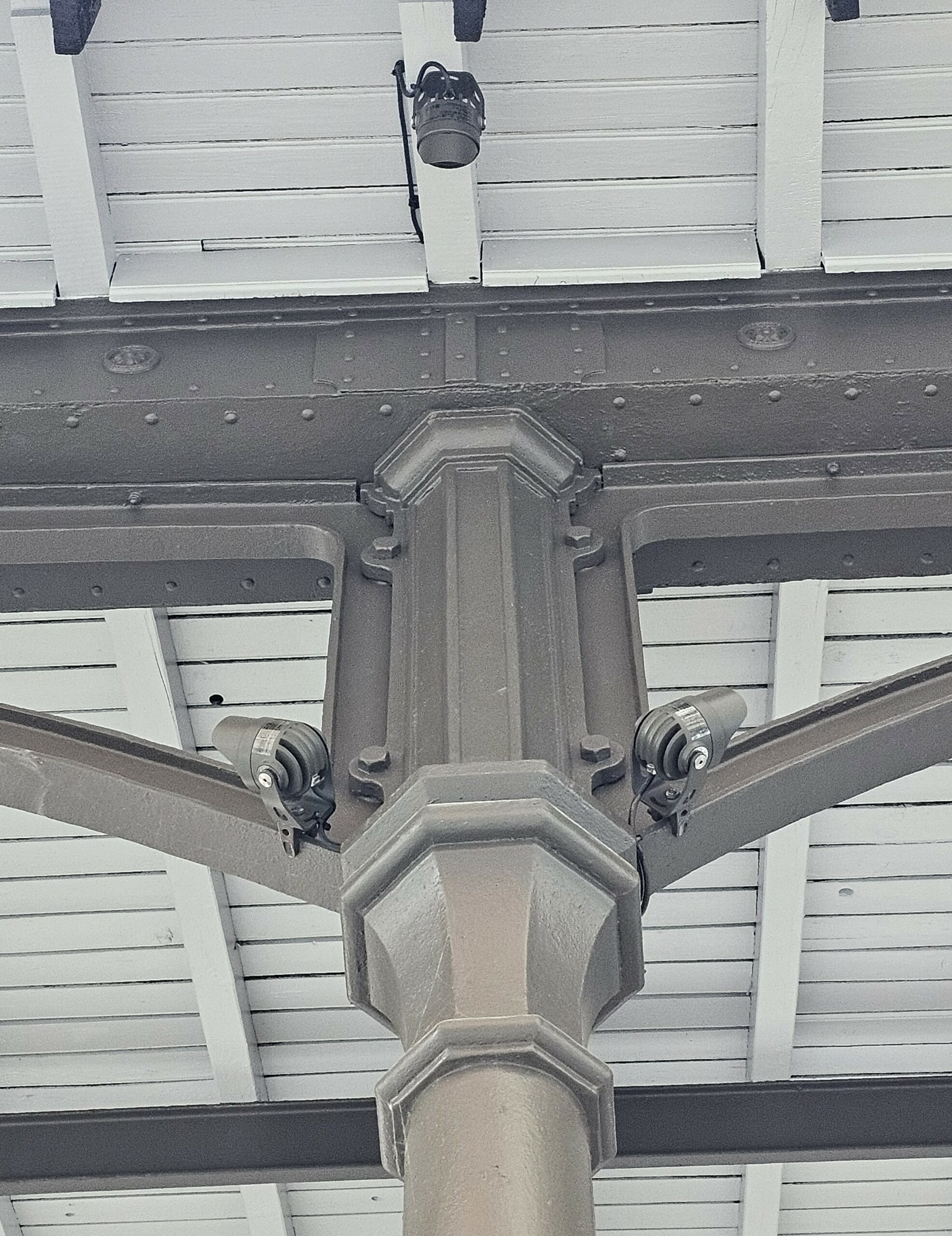 L’éclairage des terrasses des cafés en dessous a été réalisé à l’aide d’appareils disposés en plongée. Les systèmes de fixation et cheminement des câbles ont été particulièrement travaillés, pour une intégration parfaite sur l’édifice et de façon à rendre les luminaires le plus discrets possible.