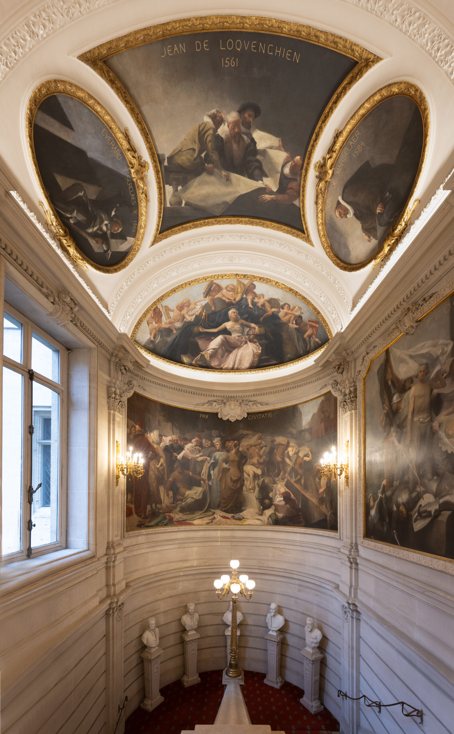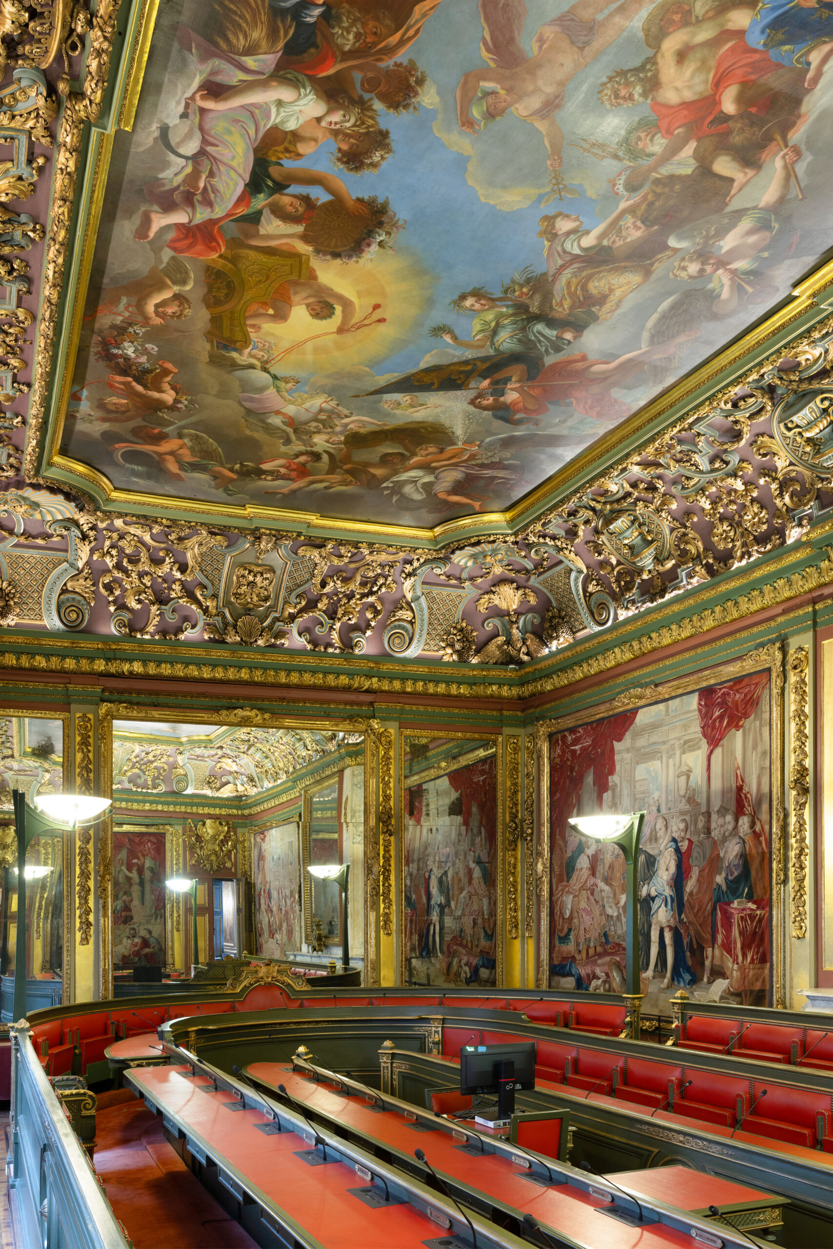 La salle du conseil méritait bien plus qu’une simple opération de dépoussiérage et de peinture comme elle en avait connu plusieurs par le passé : l’état de la toile ornant le plafond – une Assemblée des dieux censée inspirer les décisions prises en ces lieux – ne rendait plus justice au talent de son auteur, le peintre Victor Janssens. « Nous avons opté pour un éclairage en corniche en indirect avec une photométrie choisie pour obtenir une bonne uniformité de cette fresque, détaille le concepteur lumière. On nous avait demandé de conserver les lampadaires existants associés au mobilier, mais il est possible qu’ils soient supprimés, finalement. »