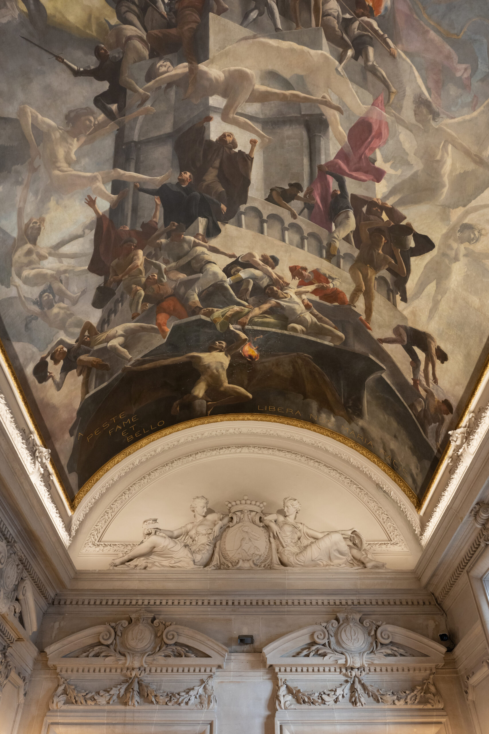 Il établit la connexion entre la cour intérieure de l’hôtel de ville et la salle gothique. Créé par Victor Jamaer, il fait partie des profonds réa- ménagements apportés au bâtiment à la fin du XIXe siècle. Les décors s’inscrivent dans cette période. On y découvre les bustes d’anciens bourgmestres de Bruxelles et la fresque du plafond peinte par Jacques de Lalaing qui re- présente un beffroi, défendu par saint Michel et les habitants de la cité contre l’attaque de trois fléaux : la faim, la peste et la guerre. « Ici, nous avons cherché à obtenir un équilibre entre les appliques du type chandeliers, qui sont restées, et l’éclairage additionnel qui met en valeur les fresques du plafond grâce à des spots disposés en corniche et un éclairage vertical très discret. Tous les éclairages sont gradables et conçus avec différents scénarios très faciles d’utilisation », ajoute Fiorenzo Namèche.