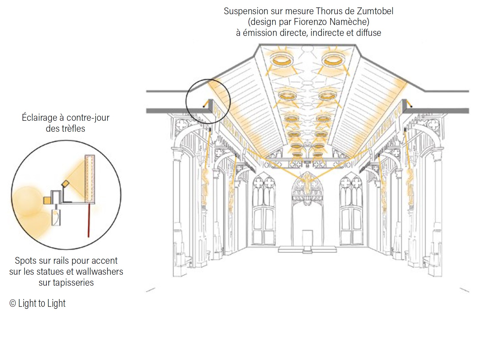 Cette mise en lumière est complétée par un éclairage périphérique des sculptures. « Tout est intégré dans l’architecture grâce un système que nous avons nous-mêmes développé, poursuit Fiorenzo Namèche. Derrière la balustrade, on a installé un éclairage à contre-jour qui souligne le contour des trèfles. Nous avons opté pour une température de couleur chaude de 2 700 K pour la lumière d’ambiance et 3 000 K pour l’éclairage direct et d’accentuation avec un IRC de 90. »