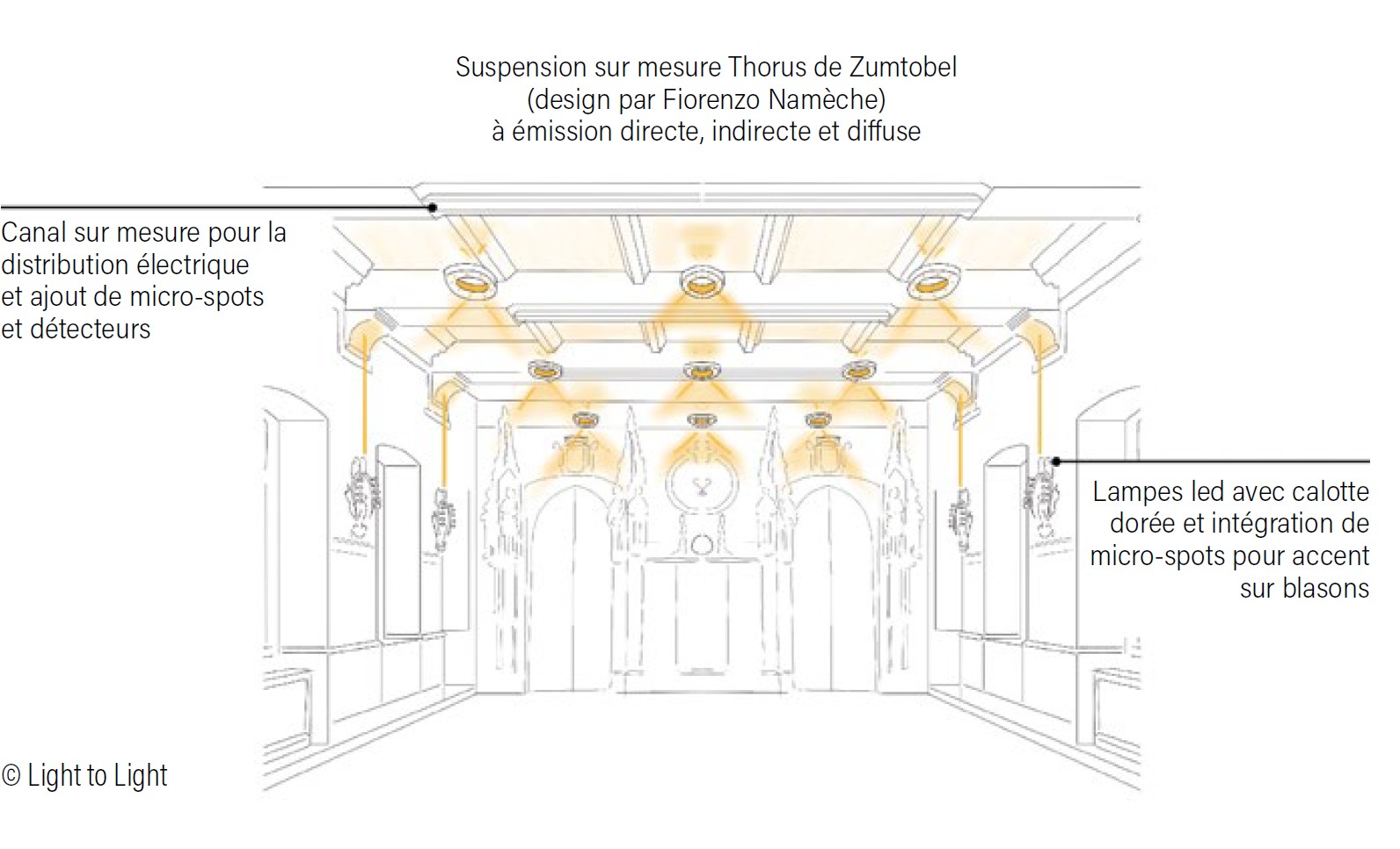 « Nous avons remplacé les lampes incandescentes des appliques “saint Michel” par des lampes à calotte argentée pour apporter un confort accru à l’espace, précise Fiorenzo Namèche. La suspension utilisée est la même que dans la salle gothique mais plus petite, offrant également une triple émission lumineuse : directe, indirecte et une diffusion à l’intérieur de la couronne. L’éclairage indirect, particulièrement extensif, a permis d’installer la suspension assez près du plafond tout en évitant les surintensités sur les peintures. Les différents types d’éclairage bénéficient chacun d’une gradation indépendante. »